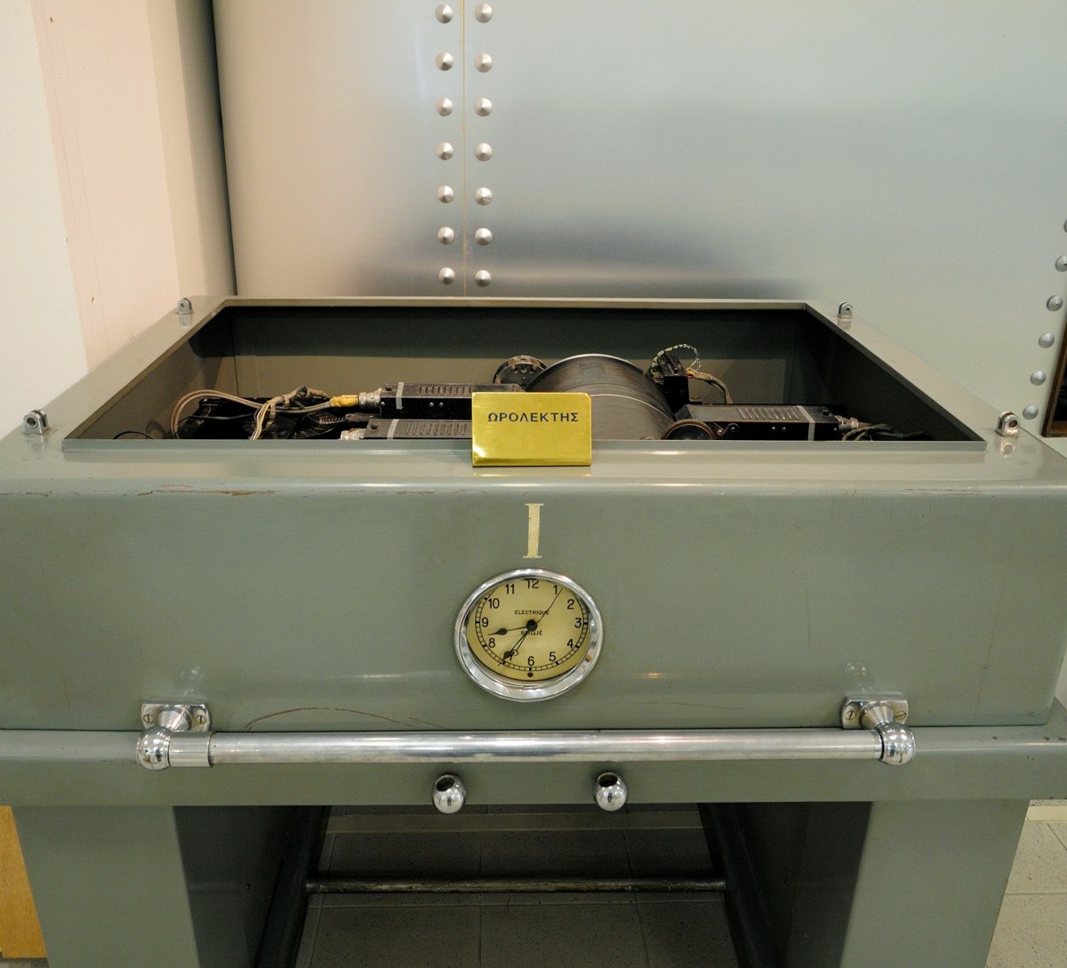 Ωρολέκτης, σε μια σιδερένια μεταλλική κατασκευή, που μοιάζει με τραπέζι, είναι τοποθετημένα ένα ρολόι μεγάλης ακρίβειας και ένας μεγάλος μεταλλικός κύλινδρος, που περιστρέφεται.