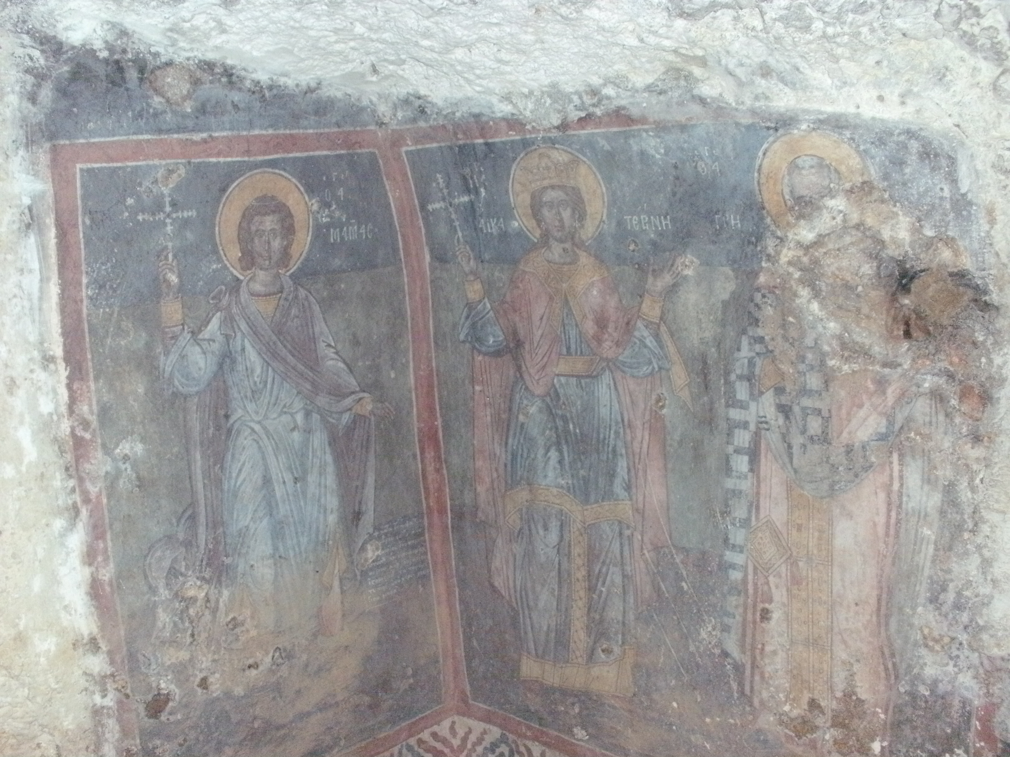 Εσωτερική άποψη του υπόγειου ασκητηρίου του Αγίου Γεωργίου του Χωστού. Εικονίζονται ο άγιος Μάμας, η αγία Αικατερίνη και ο άγιος Γρηγόριος ο Θεολόγος.