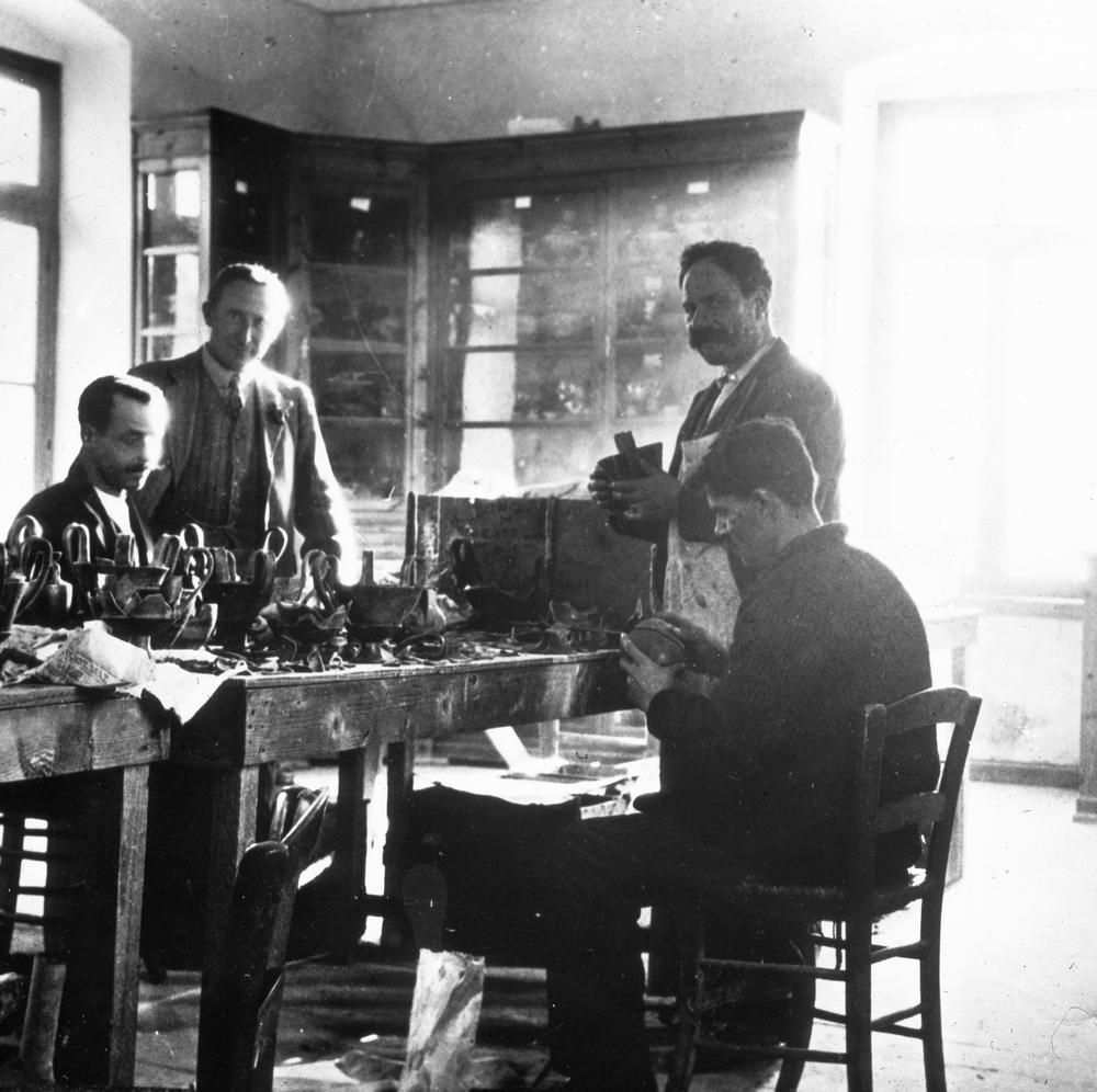 Ο Α. Κεραμόπουλλος και ο R.M. Burrows στο πρώτο Μουσείο Θηβών επιβλέπουν τη συντήρηση των ευρημάτων από την ανασκαφή της Ριτσώνας.