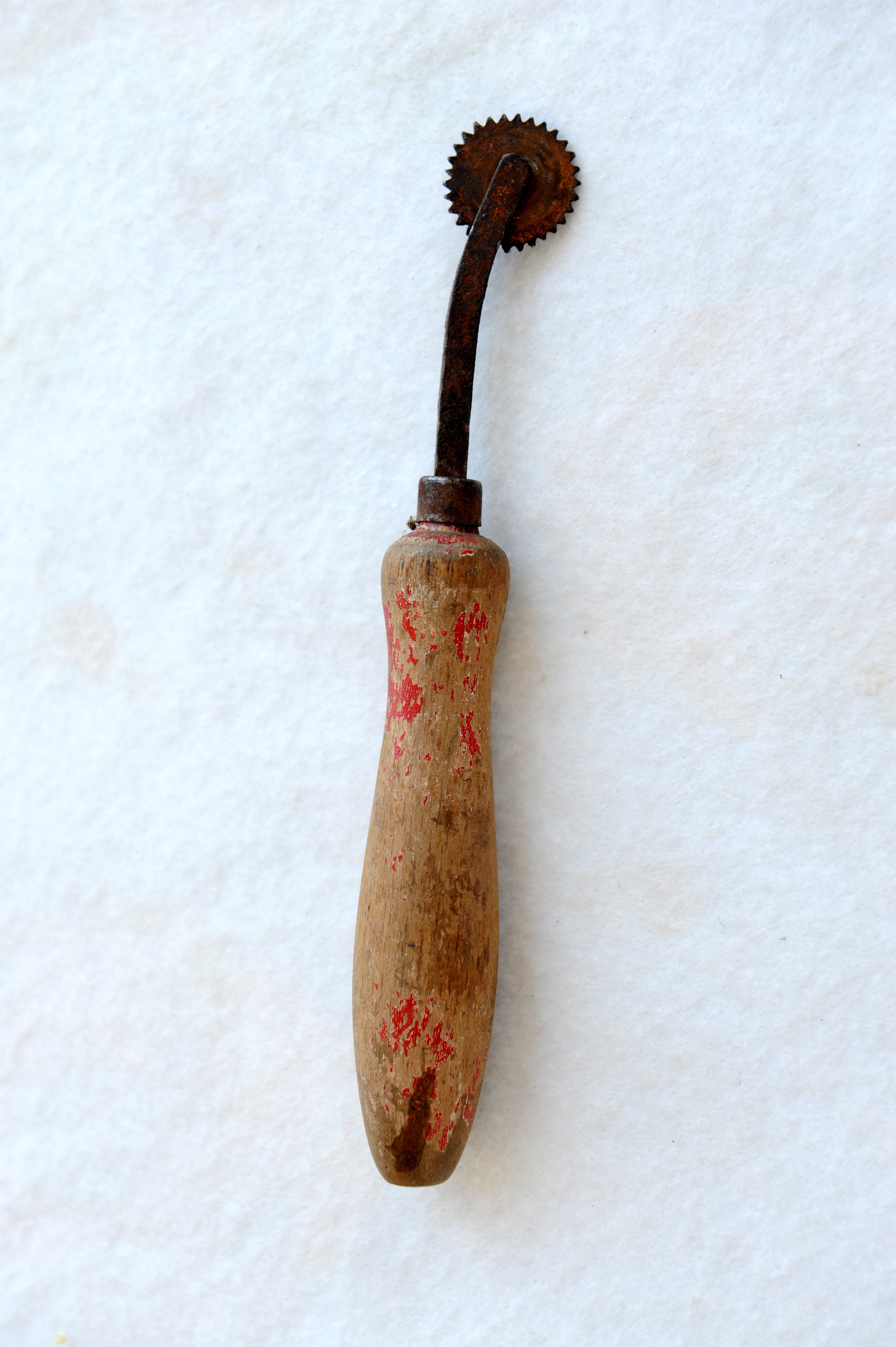 Μεταλλικό εργαλείο με ξύλινη λαβή με το οποίο ανοίγονται διπλές τρύπες στο δέρμα για το ράψιμο.