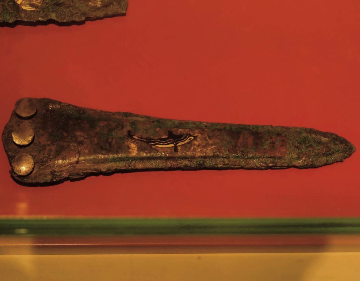 Εντυπωσιακή είναι και αυτή η λεπίδα από ένα χάλκινο εγχειρίδιο στα 18 εκατοστά, που βρέθηκε σε τάφο στην Πρόσυμνα της Αργολίδας. Φέρει ένθετη διακόσμηση με δελφίνι. Το ζώο είναι φτιαγμένο απο ελάσματα χρυσού, αργύρου και χαλκού δεμένα με νιελο και έχει στερεωθεί στην λεπίδα με εγκοπές.