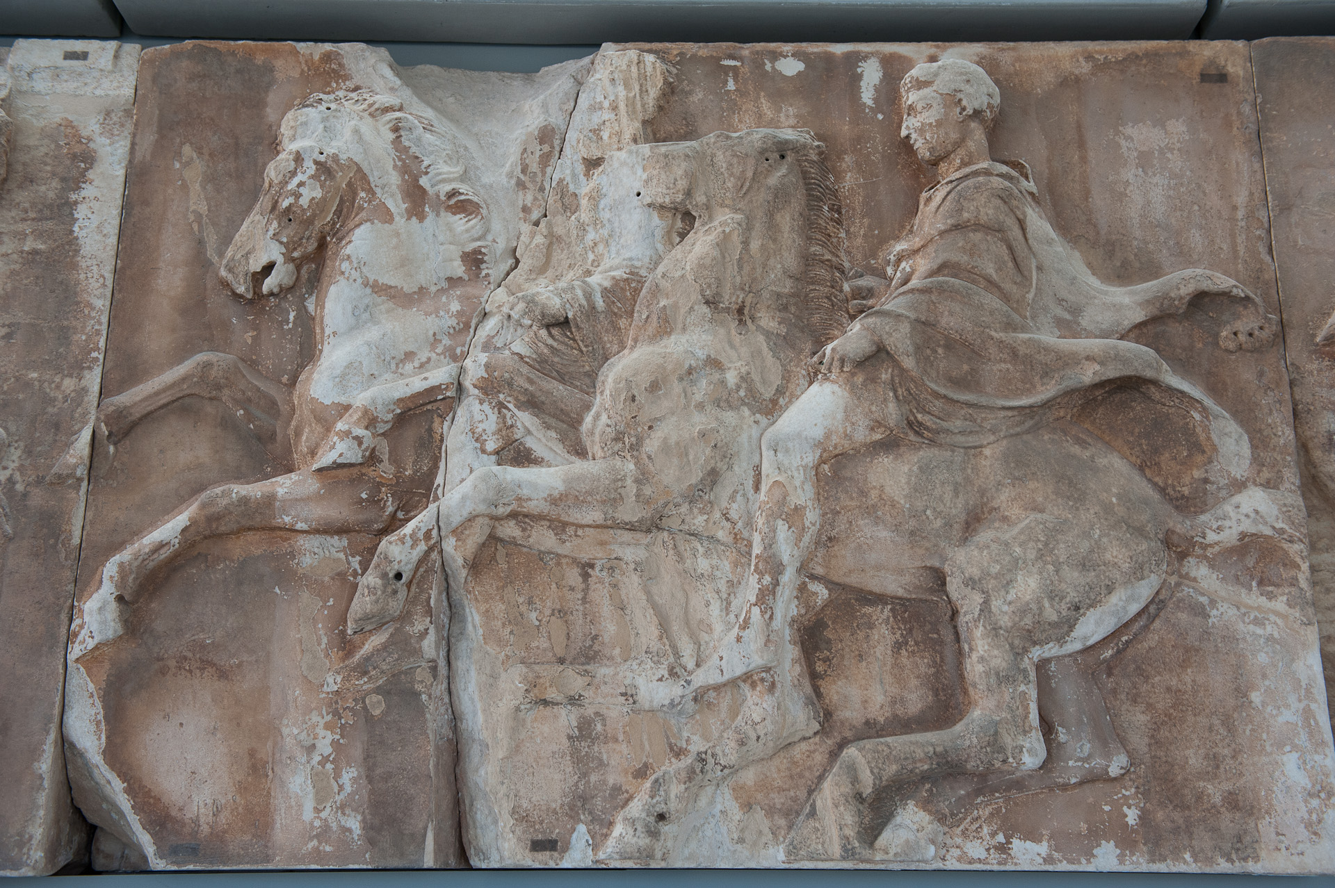 Άξια προσοχής η διαφορετική χαίτη των αλόγων με ακατάστατους θυσάνους του αριστερού αλόγου καλοχτενισμένη του δεξιού.