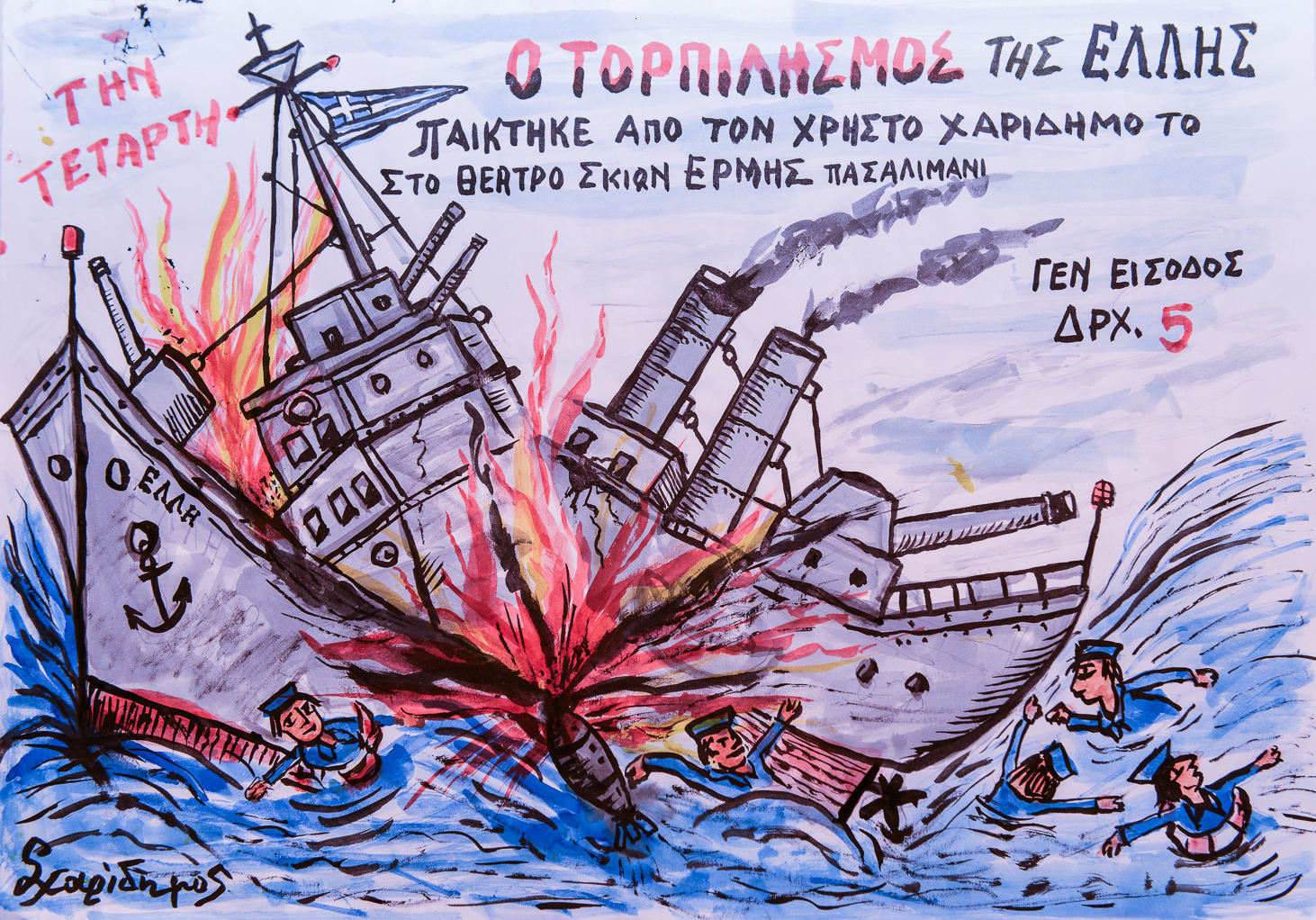 «Ο ΤΟΡΠΙΛΙΣΜΟΣ ΤΗΣ ΕΛΛΗΣ» αφίσα φιλοτεχνημένη απο το Σωτήρη Χαρίδημο, σε χαρτί με ακρυλικά.
