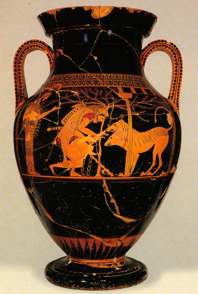 Εικονίζεται ο Ηρακλής στον Κάτω Κόσμο, ενώ προσπαθεί να δαμάσει τον δικέφαλο Κέρβερο. Στον ήρωα συμπαραστέκεται η προστάτιδά του θεά Αθηνά.