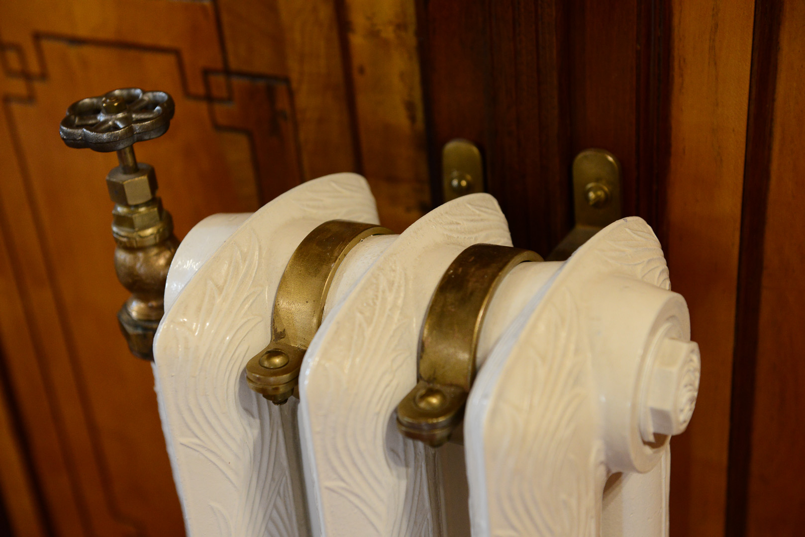 Ορειχάλκινα καλοριφέρ σε στιλ Art Nouveau με ανάγλυφα σχέδια θέρμαιναν τα διαμερίσματα του Ναυάρχου.