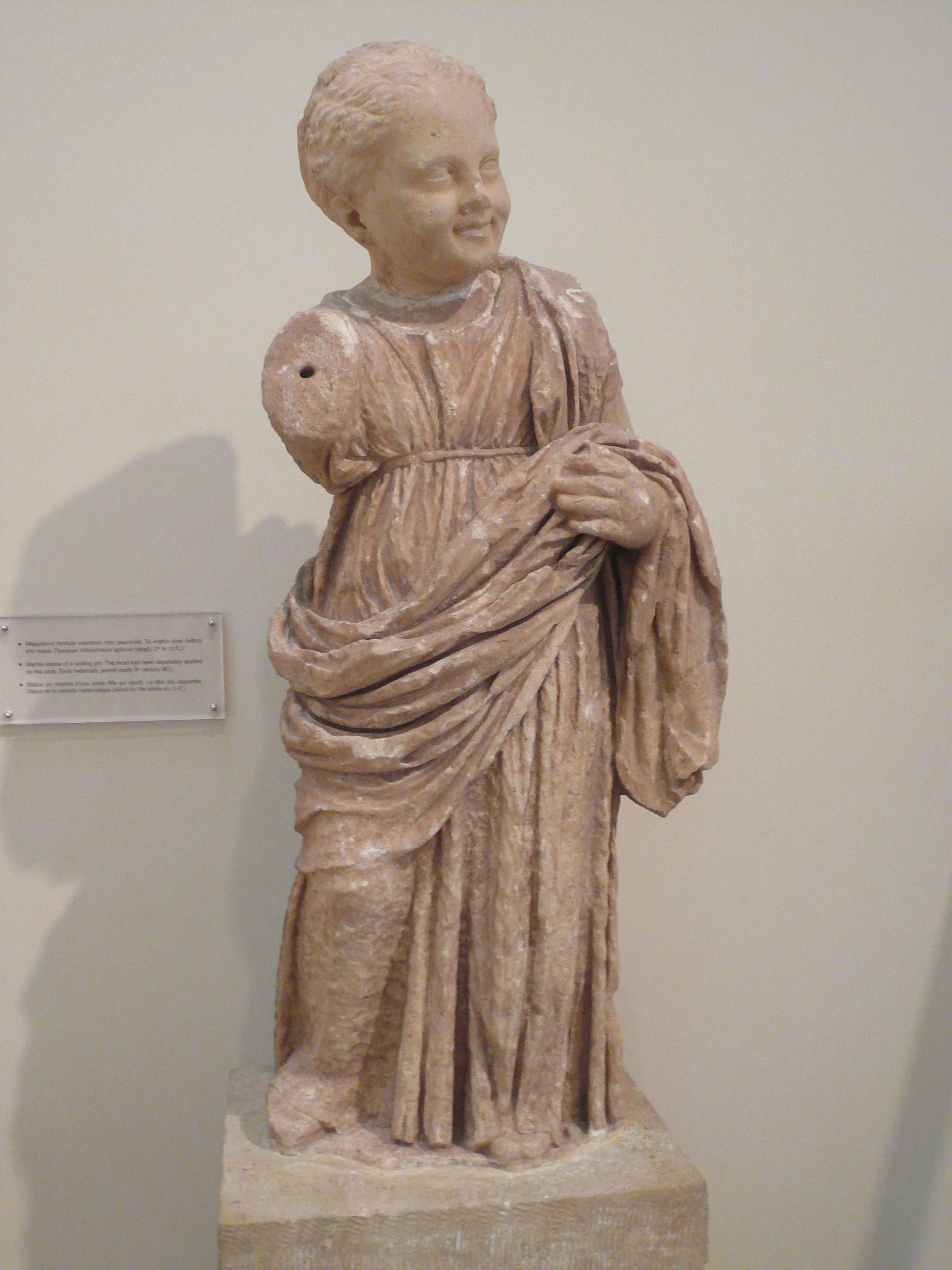 Μαρμάρινο άγαλμα κοριτσιού που χαμογελά. Το κεφάλι είναι ένθετο στο σώμα. Πρώιμων ελληνιστικών χρόνων (αρχές 3ου αι. π.Χ.). Αρχαιολογικό Μουσείο Δελφών.