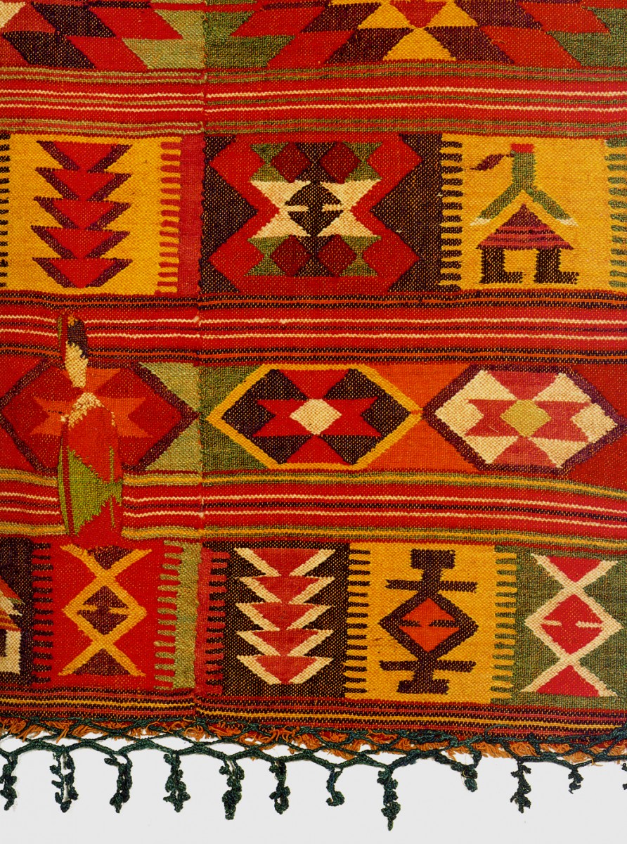 Στρωσίδι δαπέδου, «Λιοπάνα» υφαντή, πολύχρωμη, σε τρία φύλλα, με δαντέλα πλεκτή με το βελονάκι στα τελειώματα. Διακοσμητικές ρίγες και ταινίες με γεωμετρικά σχήματα και σχηματικές ανθρώπινες φιγούρες.