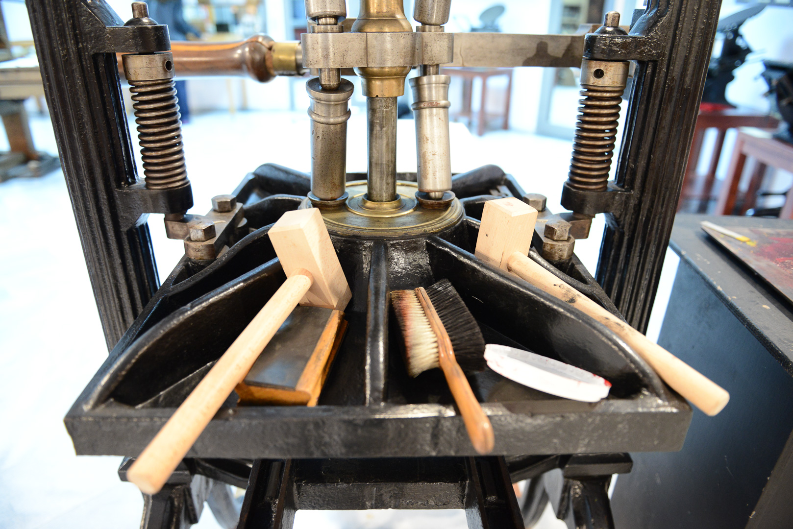 Μαντεμένιο επίπεδο τυπογραφικό πιεστήριο του 19ου αιώνα, με διάφορα εργαλεία που χρησιμοποιούσαν οι τυπογράφοι.