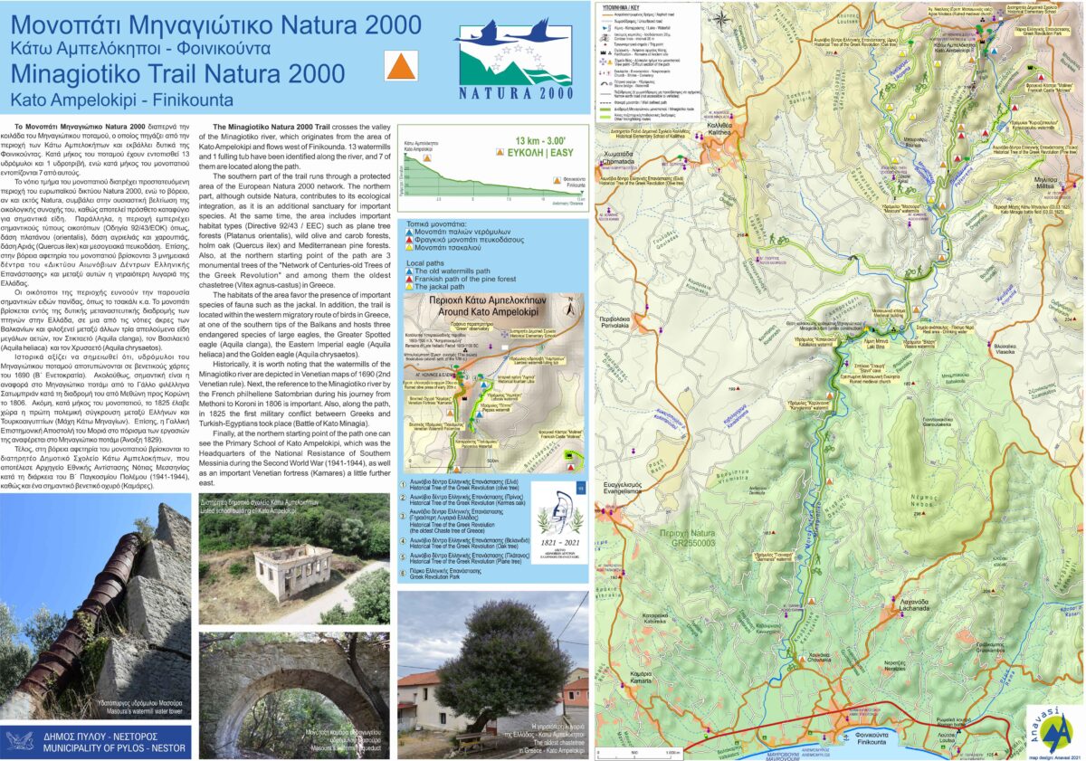 Το πρώτο από αυτά αφορά το νέο «Μονοπάτι Μηναγιώτικο Natura 2000» που ξεκινάει από τον οικισμό των Κάτω Αμπελοκήπων (υψόμετρο 350 m), διαπερνά την κοιλάδα του Μηναγιώτικου ποταμού και καταλήγει στην Φοινικούντα, ενώ έχει μήκος 13 Km (στο μέσο της κοιλάδας θα κατασκευαστεί το φράγμα Μηναγιώτικο). Κατά μήκος της κοιλάδας του ποταμού έχουν εντοπισθεί 13 υδρόμυλοι και 1 υδροτριβή, ενώ κατά μήκος του μονοπατιού εντοπίζονται 7 από αυτούς. Το νότιο τμήμα του μονοπατιού διατρέχει προστατευόμενη περιοχή του ευρωπαϊκού δικτύου Natura 2000, ενώ το βόρειο, αν και εκτός Natura, συμβάλει στην ουσιαστική βελτίωση της οικολογικής συνοχής του, καθώς αποτελεί πρόσθετο καταφύγιο για σημαντικά είδη. Παράλληλα, η περιοχή εμπεριέχει σημαντικούς τύπους οικοτόπων (Οδηγία 92/43/ΕΟΚ) όπως, δάση πλατάνου (orientalis), δάση αγριελιάς και χαρουπιάς, δάση Αριάς (Quercus ilex) και μεσογειακά πευκοδάση. Επίσης, στην βόρεια αφετηρία του μονοπατιού βρίσκονται 3 μνημειακά δέντρα του «Δικτύου Αιωνόβιων Δέντρων Ελληνικής Επανάστασης» και μεταξύ αυτών η γηραιότερη Λυγαριά της Ελλάδας. Έτσι, η χλωρίδα της περιοχής ευνοεί την παρουσία σημαντικών ειδών πανίδας όπως, τσακάλι, αλεπού κ.α. Το μονοπάτι βρίσκεται εντός της δυτικής μεταναστευτικής διαδρομής των πτηνών στην Ελλάδα, σε μια από τις νότιες άκρες των Βαλκανίων. Ως εκ τούτου, φιλοξενεί τρία σημαντικά απειλούμενα είδη μεγάλων αετών, τον Στικταετό (Aquila clanga), τον Βασιλαετό (Aquila heliaca) και τον Χρυσαετό (Aquila chrysaetos). Ιστορικά αξίζει να σημειωθεί ότι, υδρόμυλοι του Μηναγιώτικου ποταμού αποτυπώνονται σε βενετικούς χάρτες του 1690 (Β ‘΄ Ενετοκρατία). Ακολούθως, σημαντική είναι η αναφορά στο Μηναγιώτικο ποτάμι από το Γάλλο φιλέλληνα Σατωμπριάν κατά τη διαδρομή του από Μεθώνη προς Κορώνη το 1806. Ακόμη, κατά μήκος του μονοπατιού, το 1825 έλαβε χώρα η πρώτη πολεμική σύγκρουση μεταξύ Ελλήνων και Τουρκοαιγυπτίων (Μάχη Κάτω Μηναγίων). Επίσης, η Γαλλική Επιστημονική Αποστολή του Μοριά στο πόρισμα των εργασιών της αναφέρεται στο Μηναγιώτικο ποτάμι (Άνοιξη 1829). Τέλος, στην περιοχή της βόρειας αφετηρίας του μονοπατιού βρίσκεται, το διατηρητέο Δημοτικό Σχολείο Κάτω Αμπελοκήπων, που αποτέλεσε Αρχηγείο Εθνικής Αντίστασης Νότιας Μεσσηνίας κατά τη διάρκεια του Β ΄’ Παγκοσμίου Πολέμου (1941-1944) καθώς και ένα σημαντικό βενετικό οχυρό (καμάρες).