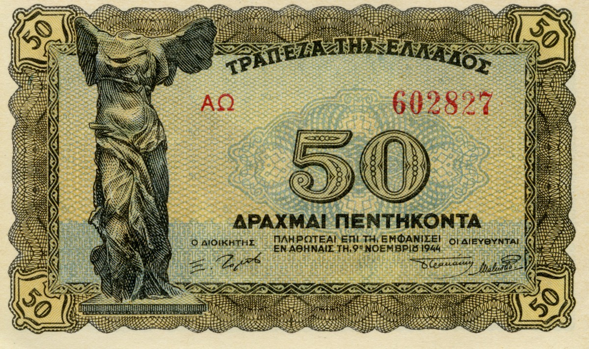 Τον Νοέμβριο του 1944 τυπώθηκε το πρώτο μετακατοχικό τραπεζογραμμάτιο, με τη Νίκη της Σαμοθράκης στην εμπρόσθια όψη και τον Φοίνικα στην οπίσθια όψη.