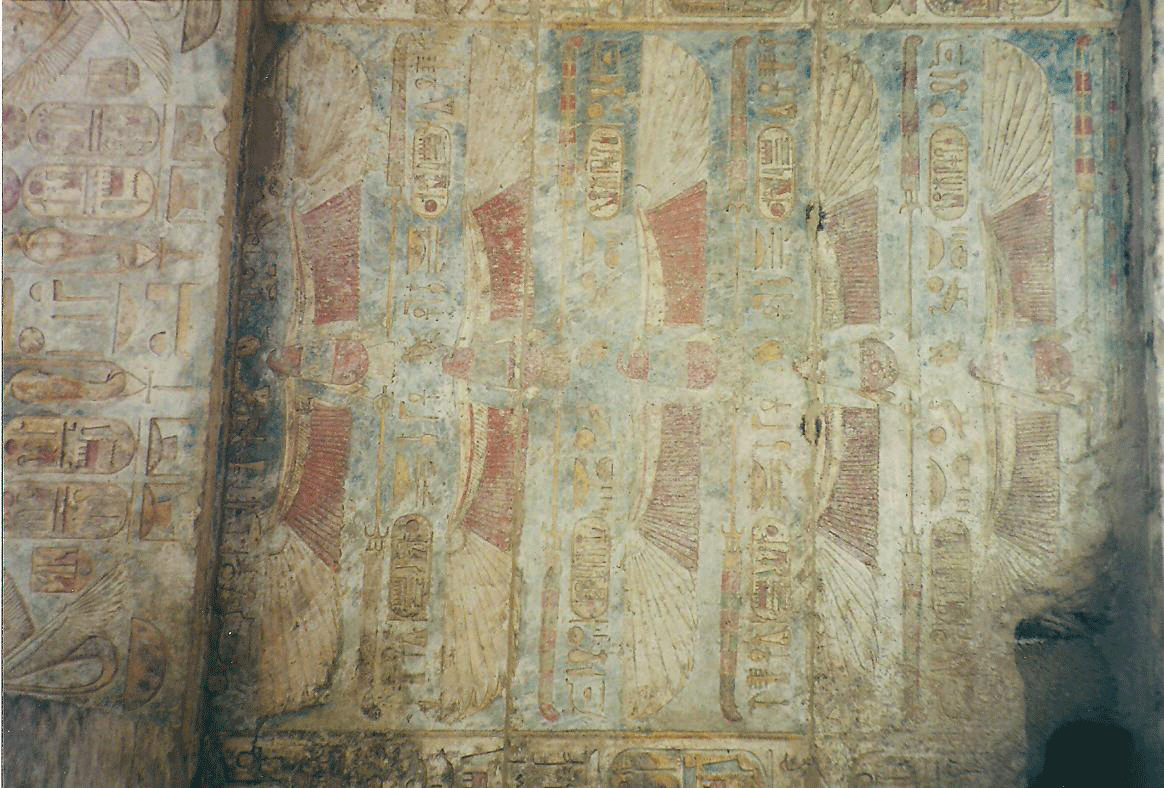 Οροφή στον ταφικό ναό του Ραμσή Γ΄στο Μεντίνετ Χάμπου, ανάγλυφη και πολύχρωμη. Ανάμεσα στα σύμβολα της βασιλικής εξουσίας, επιγραφές όπου αναφέρεται η ιδιότητα του φαραώ ως γιου του Ρα και κυρίου του ορίζοντα στην αιωνιότητα περιστοιχίζουν τη δέλτο με το όνομά του. Αίγυπτος, 1186 – 1155 π.Χ.