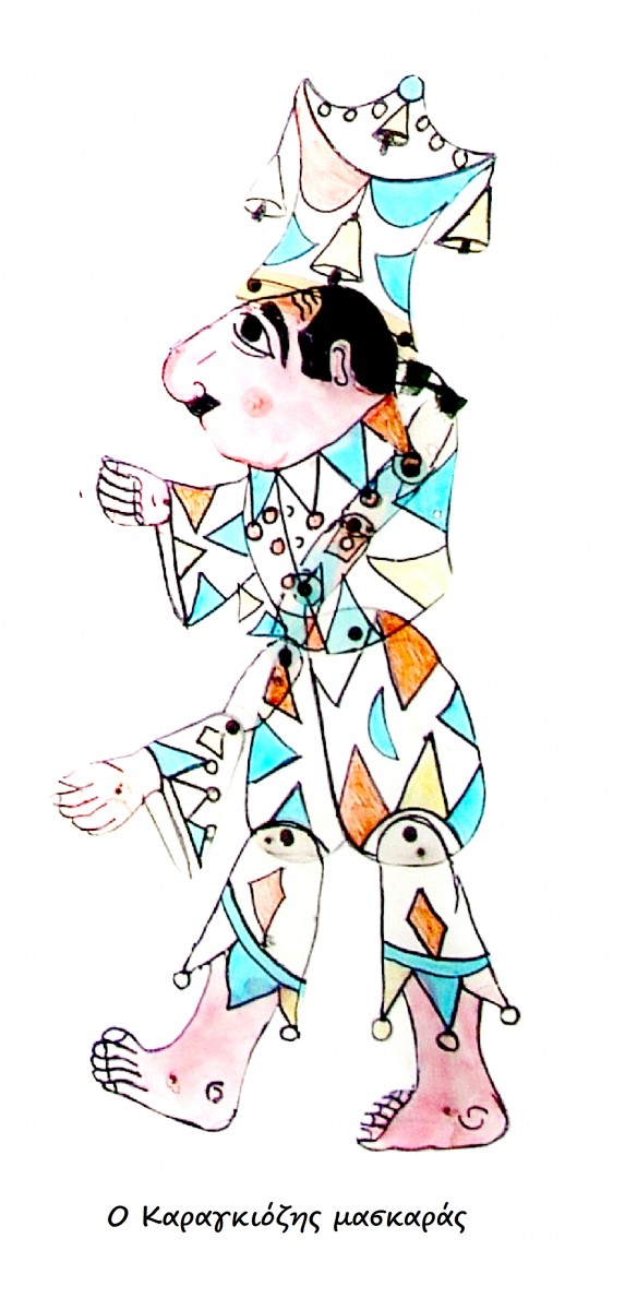 Ο Καραγκιόζης είναι ντυμένος κλόουν λόγω αποκριάς και φοράει ένα περίεργο καπέλο με καμπανάκια.