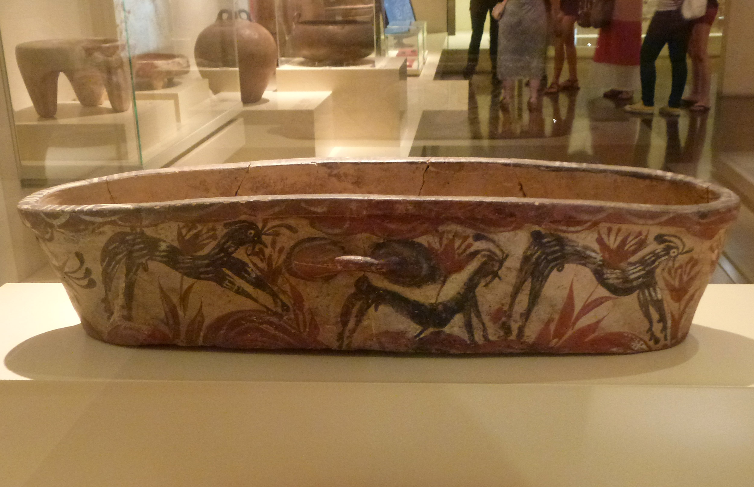 Πήλινη κύμβη (μακρόστενο ανοιχτό αγγείο) με γραπτή πολύχρωμη διακόσμηση αιγάγρων σε τοπίο με πλούσια βλάστηση στη μία όψη και δελφινιών σε θαλάσσιο τοπίο στη δεύτερη. Ακρωτήρι Θήρας. Υστεροκυκλαδική Ι περίοδος (περίπου 1600 π.Χ.). Εθνικό Αρχαιολογικό Μουσείο.