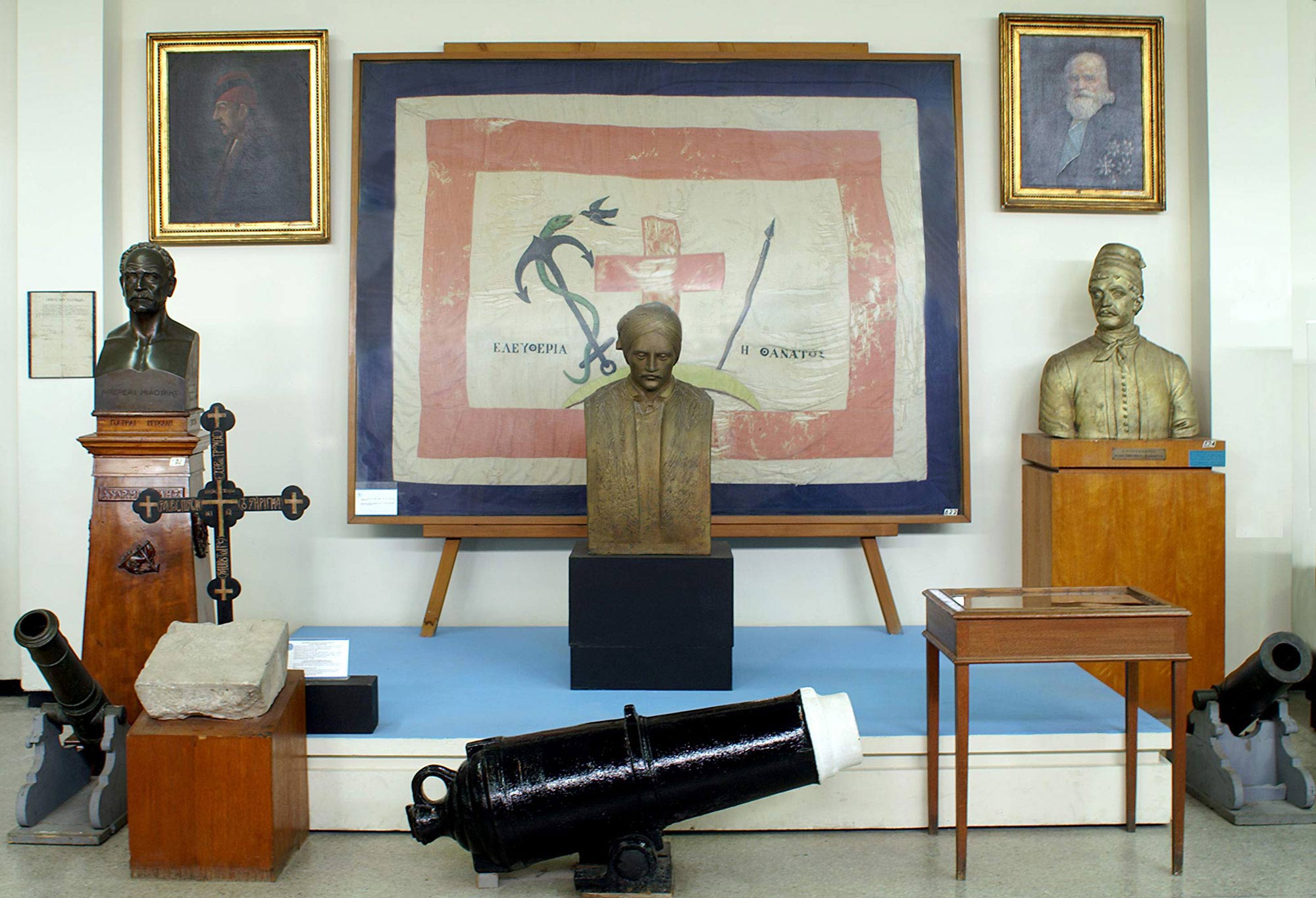 Πίσω από τις προτομές του Α. Μιαούλη και του Κ. Κανάρη υπάρχει σημαία της εποχής της Επαναστάσεως από το νησί των Σπετσών, με αλληγορικά σύμβολα. Ανήκε στο πλοίο του αγωνιστή Λαζάρου Κατσιλέρη Μουσιού.