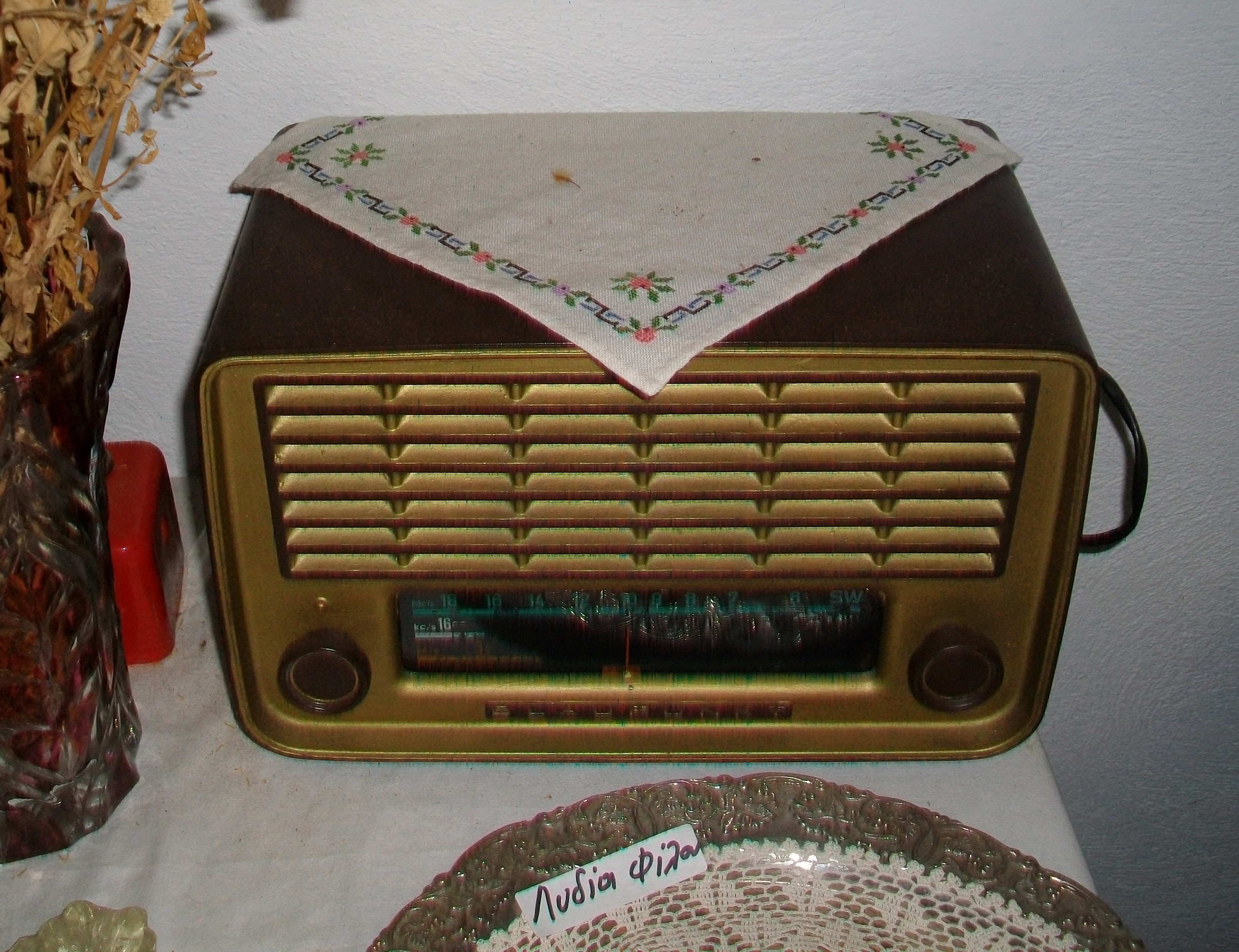 Χαρακτηριστικό ραδιόφωνο εποχής, το οποίο αποτελούσε, εκτός από χρηστικό, και διακοσμητικό στοιχείο του σπιτιού και στολιζόταν ανάλογα.