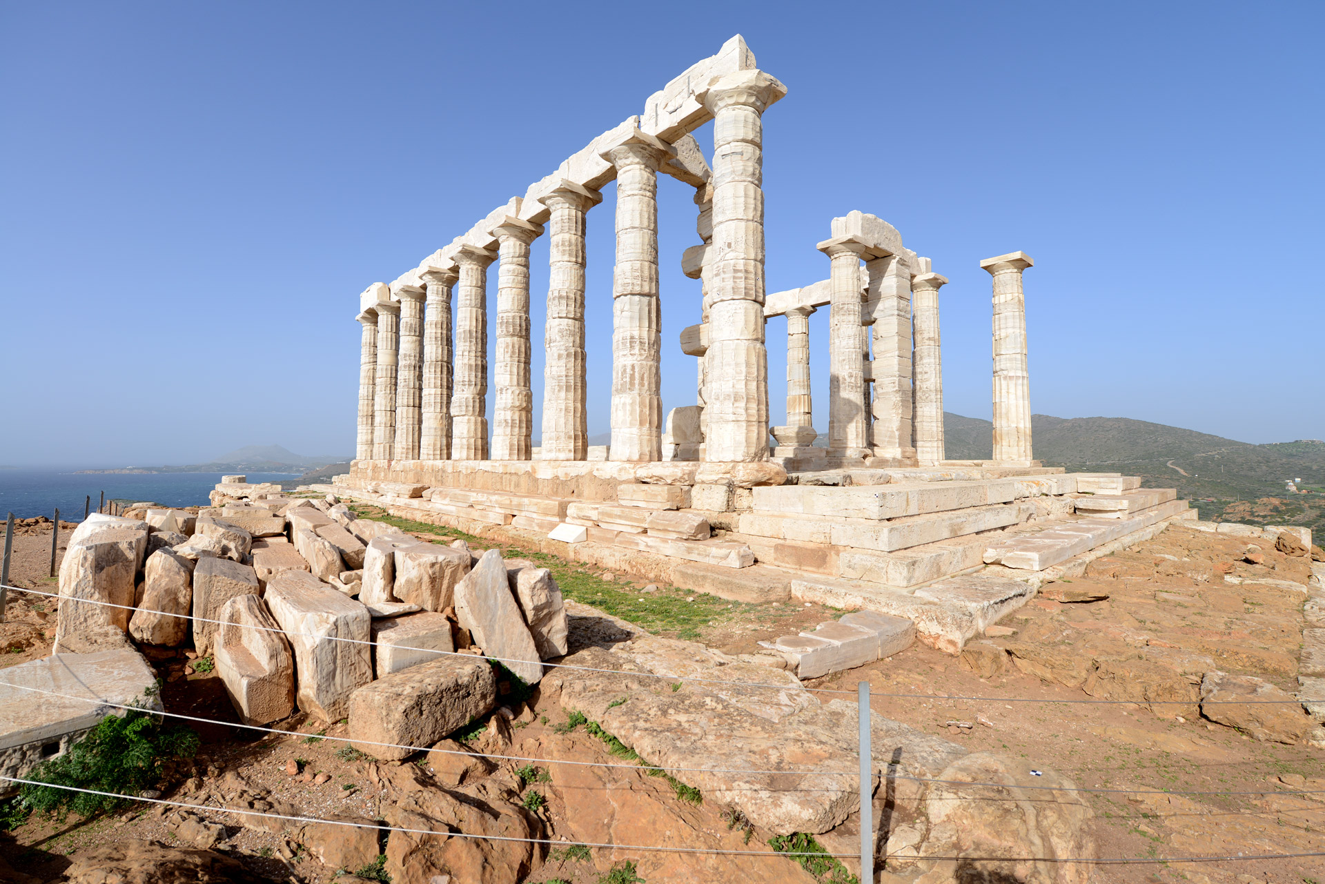 Στην κορυφή του βράχου που υψώνεται 60μ. πάνω από τη θάλασσα και περιβάλλεται από ισχυρά τείχη χτίστηκε ο ναός του Ποσειδώνα, του θεού της θάλασσας.