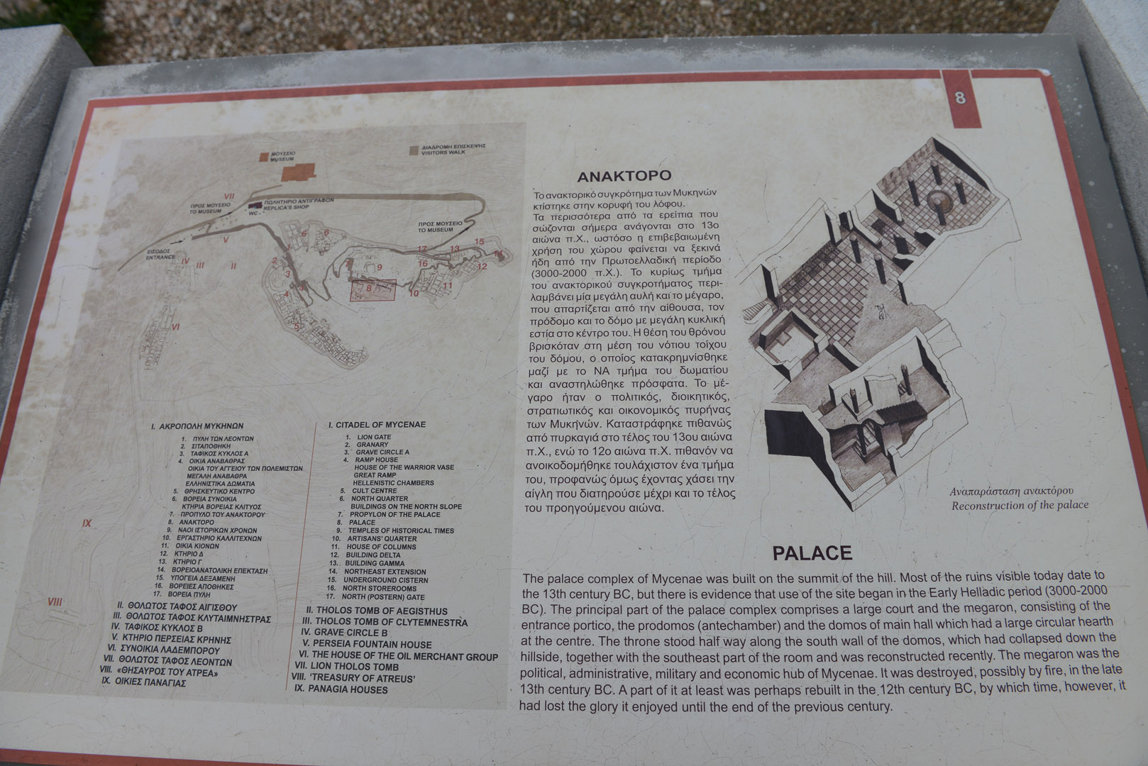 Χάρτης του αρχαιολογικού χώρου της ακρόπολης των Μυκηνών με ειδικό λήμμα για το ανάκτορο.