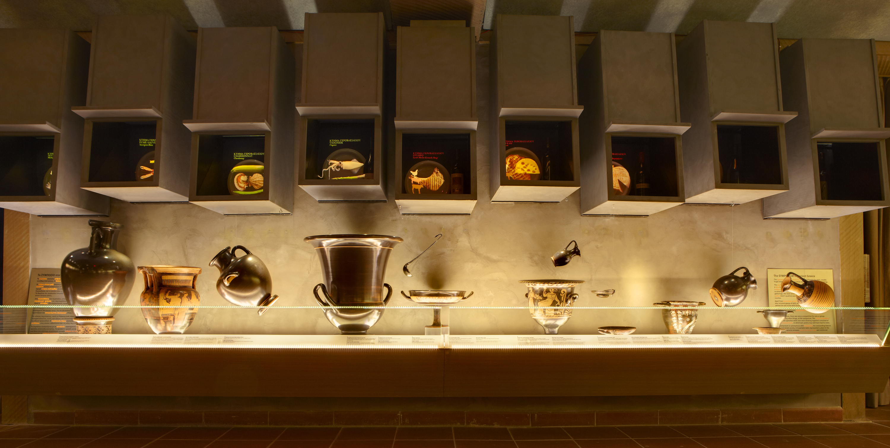Στην αίθουσα “Το ανοιχτήρι” υπάρχει η ενότητα «Το συμπόσιο στην αρχαία Ελλάδα» η συλλογή από 35 αρχαιότητες – αγγεία συμποσίου – παρουσιάζουν την ιδιαίτερη σημασία που έδιναν οι αρχαίοι Έλληνες στην κατανάλωση του οίνου, διηγούνται την ιεροτελεστία του συμποσίου και τη σημασία της δραστηριότητας αυτής στην κοινωνική και πολιτισμική ζωή της αρχαίας Ελλάδας.
