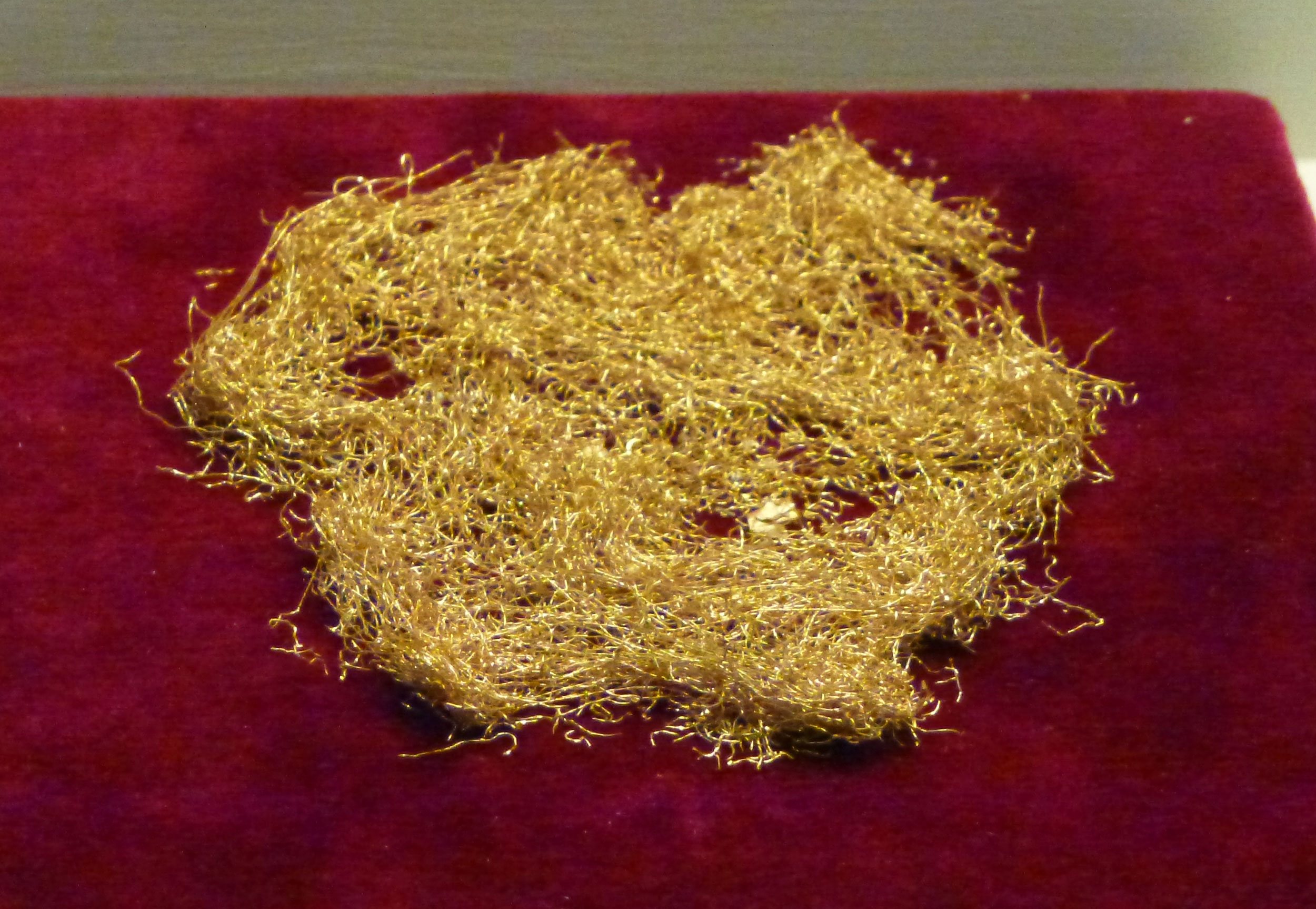 Χρυσές κλωστές υφάσματος από το πέπλο στο οποίο είχαν τυλιχθεί τα οστά της καύσης του κοριτσιού στον ασύλητο μακεδονικό τάφο Β’ της Πέλλας. 225-168 π.Χ. Αρχαιολογικό Μουσείο Πέλλας.