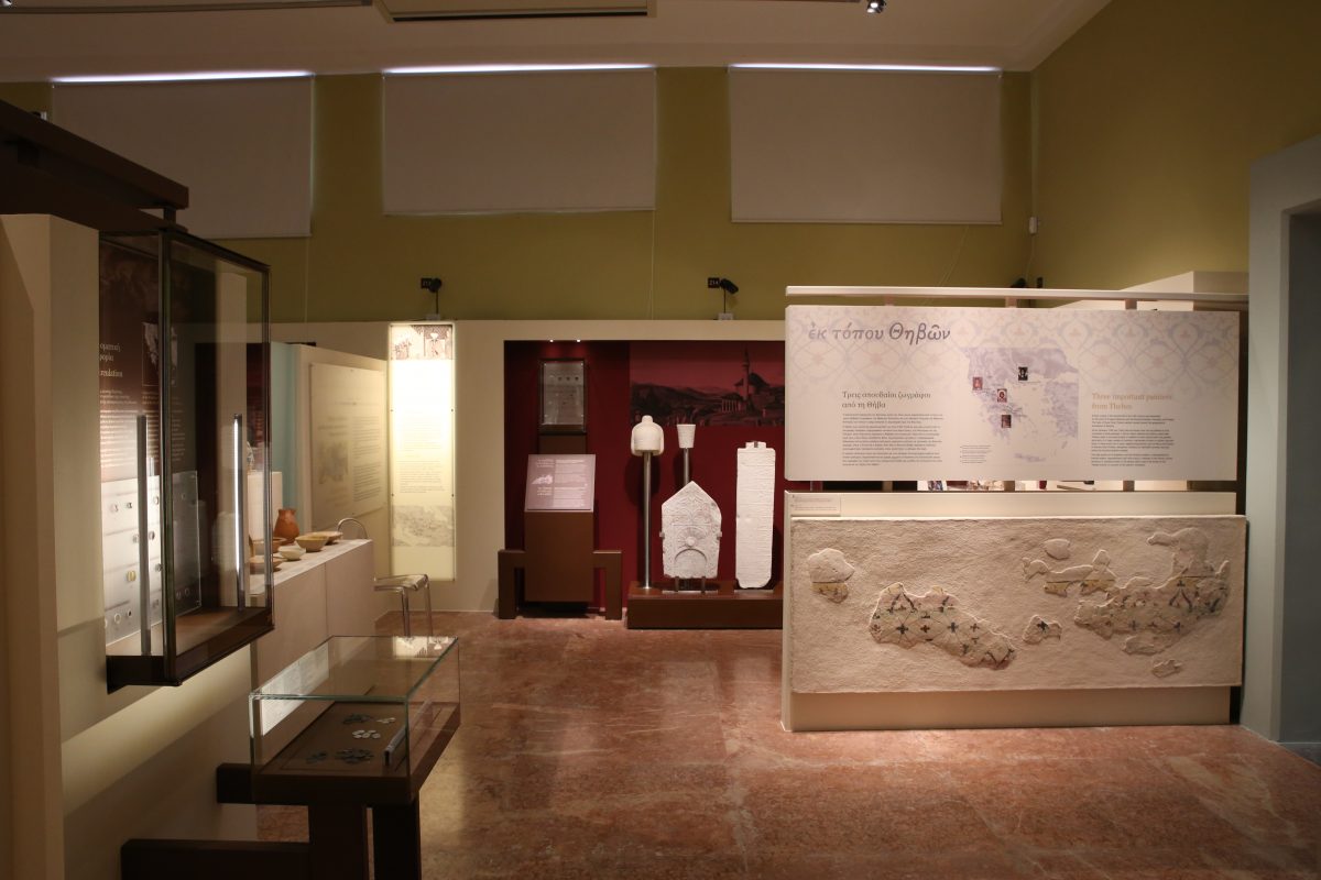 Στο βάθρο 153 εκτίθεται η αποτοιχισμένη τοιχογραφία από τη Θήβα που αποδίδεται στο εργαστήριο των αδελφών Κονταρή.