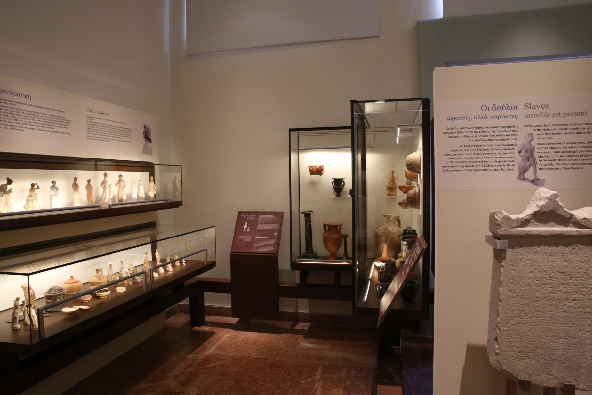 Το θέμα της δουλείας σχολιάζεται στο βάθρο 81, με την απελευθερωτική επιγραφή του 3ου αιώνα π.Χ. από τις Θεσπιές. Ο επισκέπτης συνεχίζει τη γνωριμία με τον ελληνιστικό κόσμο με την Προθήκη 158 και τη χαρακτηριστική κεραμική της περιόδου. Ξεχωρίζουν δύο κύλικες με την επιγραφή ΦΙΛΙΑC, τα αγγεία με διακόσμηση «δυτικής κλιτύος» και οι σκύφοι με ανάγλυφη διακόσμηση.