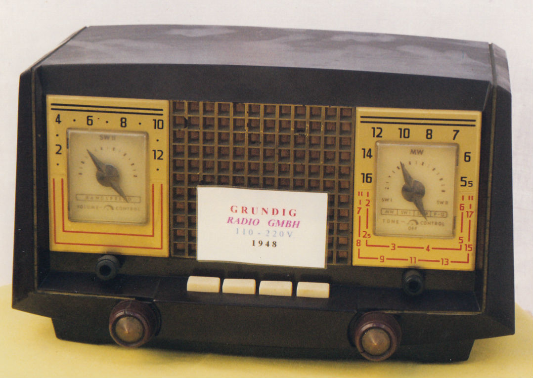 1945: Η Γερμανία αμέσως μετά τον πόλεμο ήταν σε ερείπια. Έτσι η εταιρεία Max Grundig αναγνωρίζοντας τα σημάδια των καιρών κατασκευάζει τις πρώτες συσκευές Grundig.