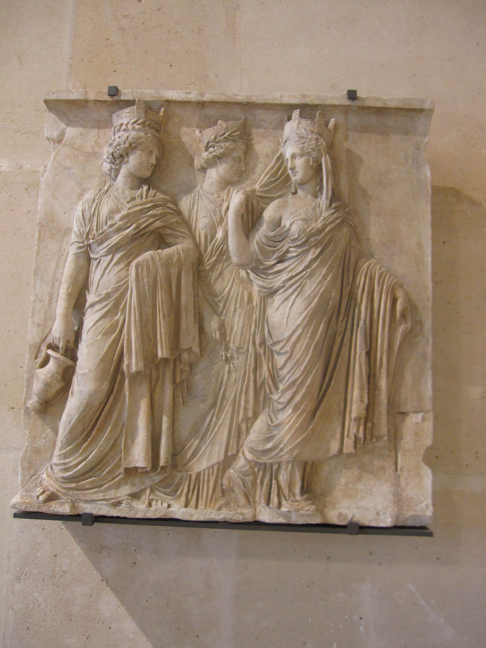 Ανάγλυφο γνωστό ως «Οι τρεις Τύχες». Βρέθηκε στη Ρώμη και συμβολίζει τρεις πόλεις. Πιθανώς προέρχεται από το Triopius, όπου ο Ηρώδης Αττικός έχτισε ταφικό μνημείο προς τιμήν της συζύγου του Αννίας Ρηγίλλης, τον 2ο αι. μ.Χ. Μουσείο του Λούβρου, Παρίσι.