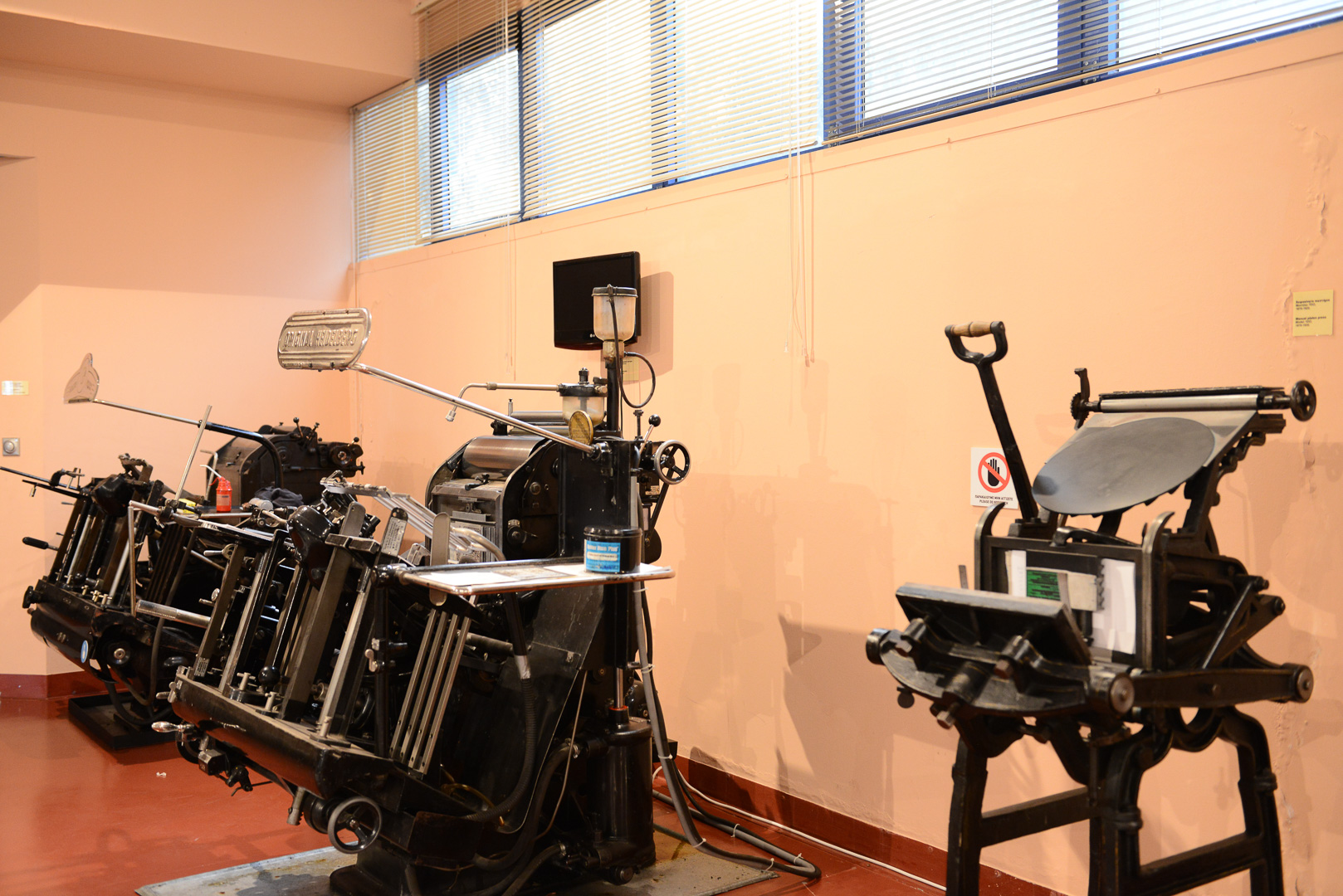 Στο κέντρο δεσπόζει το γερμανικό αυτόματο τυπογραφικό πιεστήριο “Original Heidelberg” (1920-1970).