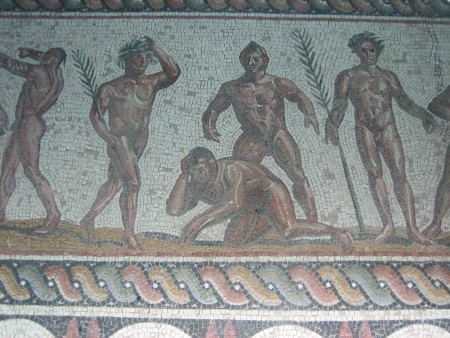 Οι μονομαχικές σκηνές είναι μόλις τρεις. Προέρχονται από την Κω [σημ. 16] (εικ. 3) και την Πάτρα [σημ. 17]. Οι δυο πόλεις ήταν ρωμαϊκές αποικίες, στοιχείο που εν μέρει ερμηνεύει την παρουσία τέτοιων παραστάσεων [σημ. 18]. Οι μονομάχοι απεικονίζονται με την εξάρτυσή τους. Στις παραστάσεις του ελλαδικού χώρου απεικονίζονται μόνο οι τύποι του ρετιάριου και του provocator (βαρέως οπλισμένος μονομάχος). Δίπλα στα ζευγάρια των μονομάχων στέκεται πάντα ο ενδεδυμένος διαιτητής (summa rudis) με τη ράβδο του (rudis) ανά χείρας. Σεόλες τις περιπτώσεις οι μορφές συνοδεύονται από επιγραφές με τα ονόματά τους, τα οποία είναι παρωνύμια. Οι θηριομαχικές σκηνές είναι δέκα. Φαίνεται πως οι αγώνες αυτοί ήταν πιο δημοφιλείς από τους μονομαχικούς. Οι θηριομάχοι απεικονίζονται φτωχά οπλισμένοι, με δόρυ, εγχειρίδιο, μαστίγιο. Τα αντίπαλα ζώα είναι εξωτικά (λεοπάρδαλη, λιοντάρι, τίγρης κ.ά.), του δάσους (αρκούδα, αγριόχοιρος, λύκος κ.ά.), αλλά και ο ταύρος, η κατσίκα, το άλογο κτλ. Η πιο εντυπωσιακή παράσταση είναι αυτή της Κω [σημ. 19]. Σε αυτήν κατονομάζονται με επιγραφές οι περισσότεροι θηριομάχοι, αλλά και τα ζώα. Επίσης, ενδιαφέρον στοιχείο αποτελεί η αφηγηματικότητα, καθώς είναι δυνατόν να αναγνωριστεί η αφήγηση τεσσάρων διαφορετικών μεταξύ τους επεισοδίων σε συνεχόμενες σκηνές χάρη στην αναγραφή των ονομάτων και την πανομοιότυπη απόδοση των μορφών.