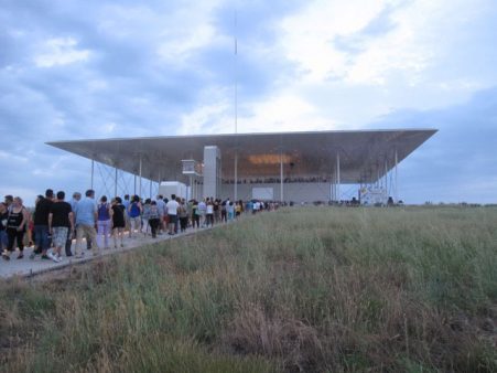 Ο χώρος της αγοράς αποδείχτηκε πραγματική «αγορά»· οι ουρές, τα πηγαδάκια, οι συζητήσεις, τα σχόλια, μια διάχυτη ευφορία. Και εκεί στον χώρο που ενώνει τα δύο κτήρια, της Λυρικής Σκηνής και της Εθνικής Βιβλιοθήκης, μας καλωσόριζε ο Παναγιώτης Τέτσης.