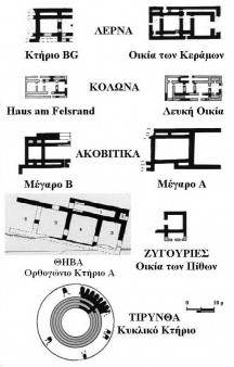Η θέση Κολώνα στην Αίγινα δεν μπορεί να θεωρηθεί ως ένας αυτοτελής Πρωτοελλαδικός οικισμός. Μετατράπηκε σε μικρό οικισμό μόνο σε υστερότερη φάση, όταν προσεκτικά σχεδιασμένα κτήρια με μικρά και λιγοστά δωμάτια ανεγέρθηκαν και ο οικισμός απέκτησε την τελική του μορφή (Αίγινα V). Τα φτωχικά ερείπια της φάσης Αίγινα Ι-ΙΙ (πριν το 2500-2400 π.Χ.) αποκαλύπτουν ότι ο βασικός οικιστικός τύπος υπήρξε η μακρόστενη οικία με πλίνθινους τοίχους. Στην πραγματικότητα, φαίνεται ότι ήδη κατά τη φάση Αίγινα ΙΙ ο οικισμός γνώρισε αξιοσημείωτη οικονομική ανάπτυξη και απέκτησε το δικό του διοικητικό κέντρο, το λεγόμενο κτήριο «Haus am Felsrand» (εικ. 1). Κατά τη φάση Αίγινα ΙΙΙ (2400-2300 π.Χ.), οι μαρτυρίες για οικονομική ανάπτυξη, διοικητική και κοινωνική οργάνωση του οικισμού γίνονται πιο σαφείς. Η «Λευκή Οικία» (Weisses Haus) (εικ. 1, 4) αποτελεί το μνημειώδες κοινοτικό κτήριο που διαδέχθηκε το «Haus am Felsrand» το οποίο πιθανότατα είχε παρόμοια λειτουργία [σημ. 11]. Το κτήριο είναι μία παραλλαγή κτηρίου με διαδρόμους, διαστάσεων 20Χ9 μ., ενώ η ονομασία του προήλθε από τους πλίνθινους τοίχους οι οποίοι ήταν επιχρισμένοι με λευκό κονίαμα. Πέντε δωμάτια στη σειρά περιστοιχίζονταν από στενούς διαδρόμους. Οι διαστάσεις είναι μικρότερες σε σύγκριση με τα προηγούμενα παραδείγματα στη Λέρνα και στα Ακοβίτικα αλλά το γενικότερο πλάνο είναι πανομοιότυπο. Το κεντρικό μεγαλύτερο δωμάτιο περιείχε εστία στο μέσον. Κλιμακοστάσια, διαμερίσματα και ένας άνω όροφος με ανοιχτούς χώρους και μεγαλύτερα δωμάτια πρέπει να αποτελούσαν κάποια από τα επιπρόσθετα χαρακτηριστικά της «Λευκής Οικίας» [σημ. 12]. Κατά τη φάση Αίγινα IV (2300-2200 π.Χ.), φαίνεται ότι η «Λευκή Οικία» κατέρρευσε και μικρότερα δωμάτια, πιθανόν εργαστήρια, κατασκευάστηκαν στο ίδιο σημείο, σε ένα από τα οποία βρέθηκαν εγκαταστάσεις για τήξη χαλκού.