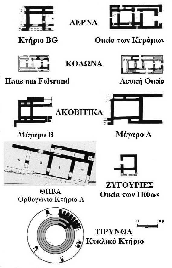 Το κτήριο με διαδρόμους αποτελεί τον σημαντικότερο αρχιτεκτονικό τύπο της ΠΕ ΙΙ περιόδου στην ηπειρωτική Ελλάδα (εικ. 1). Η εμφάνιση και η εξαφάνισή του συμπίπτουν με την έναρξη και το τέλος αντίστοιχα της ΠΕ ΙΙ περιόδου και στοιχεία για προδρομικούς τύπους του είδους δεν έχουν ακόμη εντοπισθεί. Τα κυριότερα χαρακτηριστικά του κτηρίου με διαδρόμους, με το καλύτερο δείγμα να βρίσκεται στη Λέρνα Αργολίδος, αποτελούν το ορθογώνιο σχήμα, τα τετράγωνα δωμάτια διαφόρων διαστάσεων και η κεκλιμένη, κεραμωτή οροφή. Πρόσθετα χαρακτηριστικά όπως κλιμακοστάσια, επιχρισμένοι τοίχοι, φωταγωγοί και βεράντες εξαρτώνται από την ποιότητα και τη σημασία κάθε κτηρίου όπως και από τον ρόλο που το συγκεκριμένο κτήριο διαδραμάτιζε στην περιοχή σε προκαθορισμένες χρονικές περιόδους. Τα πιο γνωστά παραδείγματα κτηρίων με διαδρόμους αποτελούν το «Κτήριο BG» και η «Οικία των Κεράμων» στη Λέρνα (εικ. 1-3), τα «Μέγαρα» Α και Β στα Ακοβίτικα Μεσσηνίας (εικ. 1), το «Οχυρωμένο Κτήριο» ή «Ορθογώνιο Κτήριο» Α στη Θήβα (εικ. 1), η «Λευκή Οικία» στην Κολώνα Αίγινας (εικ. 1, 4) και η «Οικία των Πίθων» στις Ζυγουριές (εικ. 1, 5) [σημ. 2]. Στην ίδια κατηγορία ανήκει και το «Κυκλικό Κτήριο» (Rundbau) στην Τίρυνθα παρά το κάπως διαφορετικό αλλά εξίσου χαρακτηριστικό κυκλικό σχέδιο της κατασκευής του (εικ. 1, 6-7) [σημ. 3].