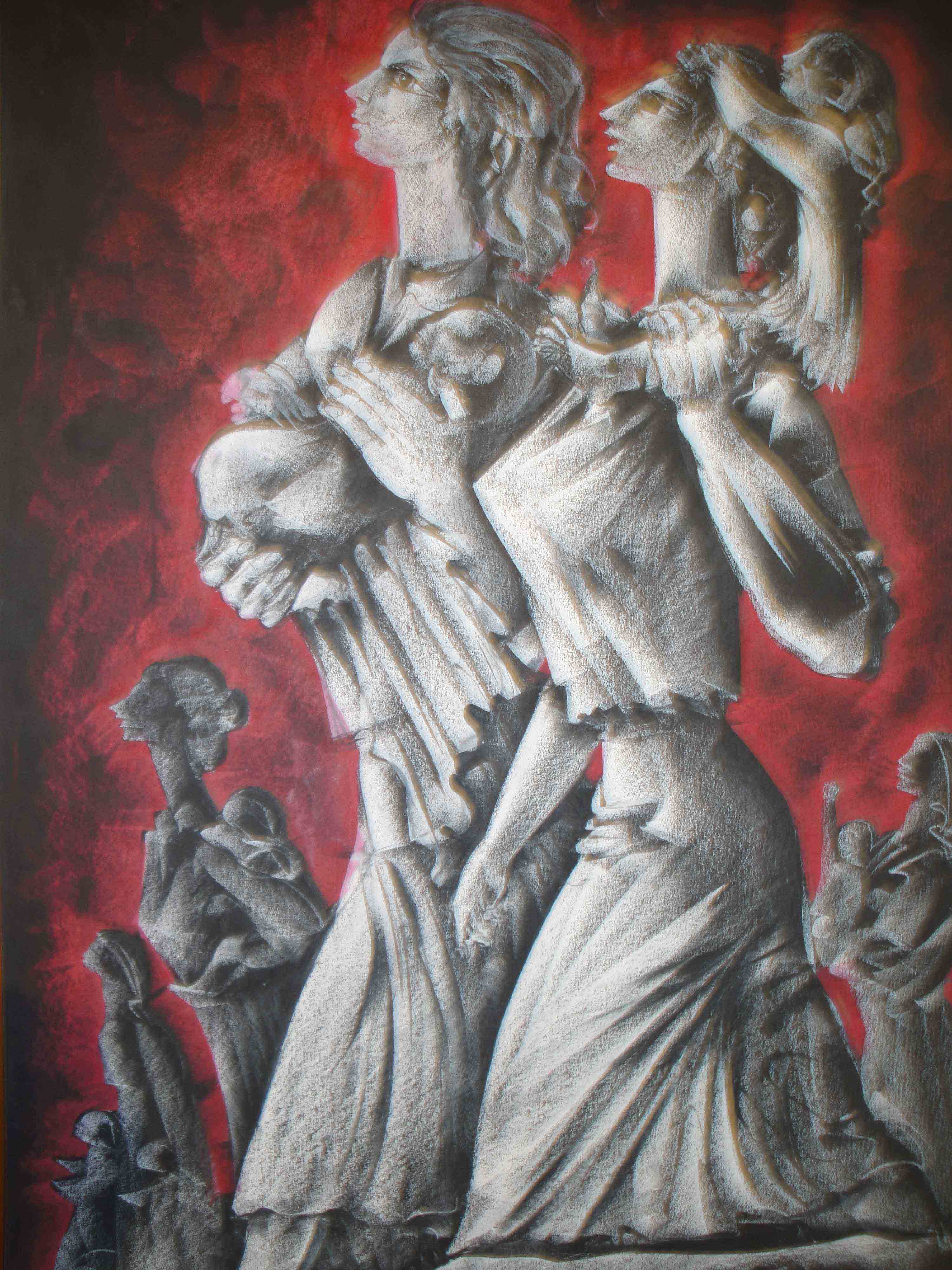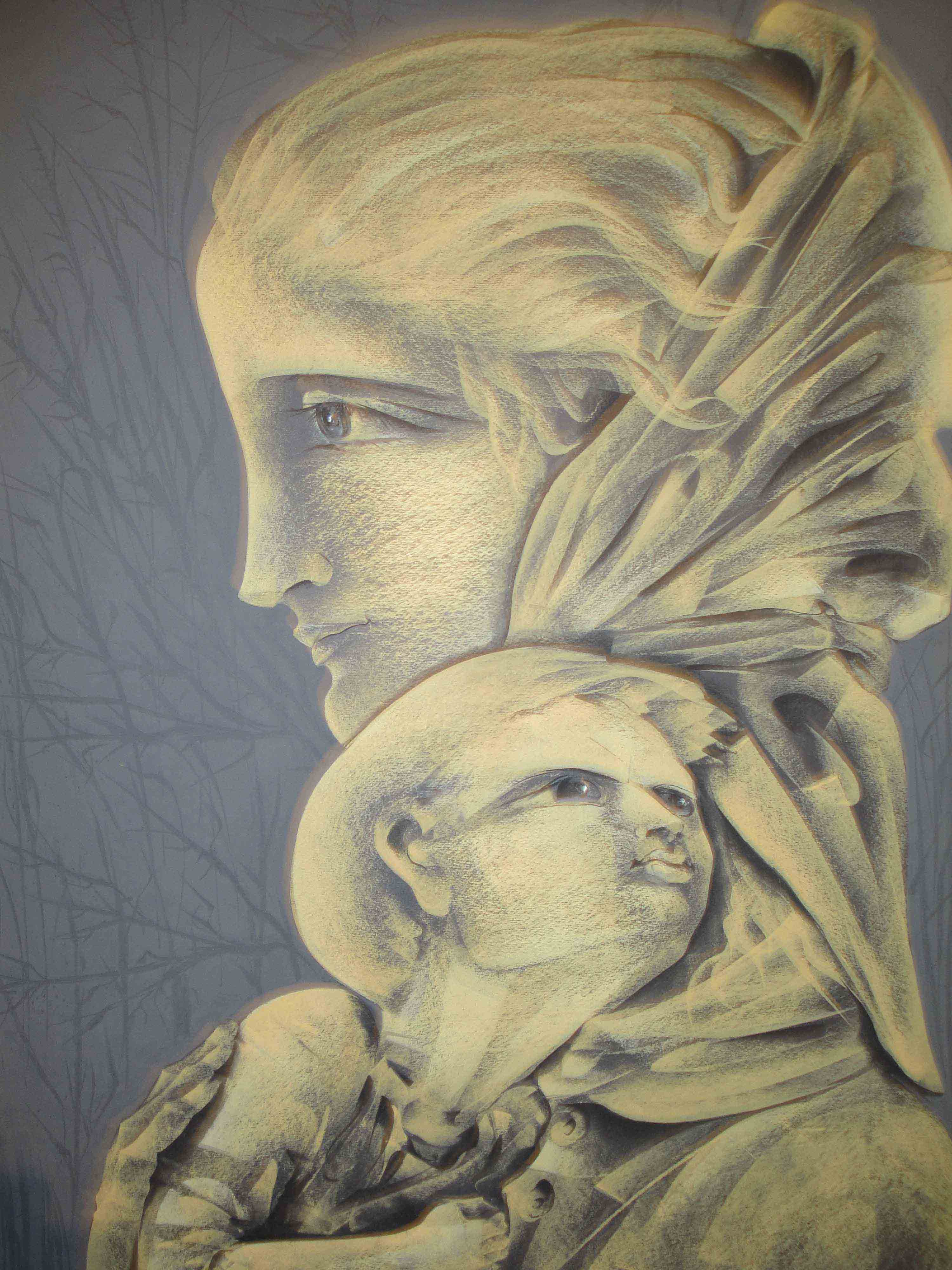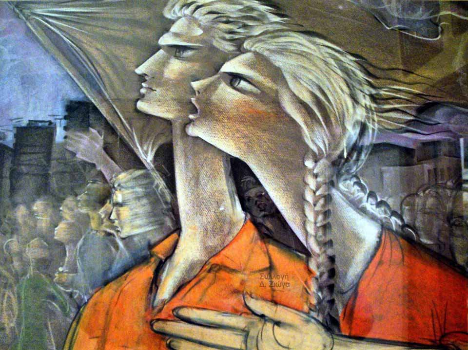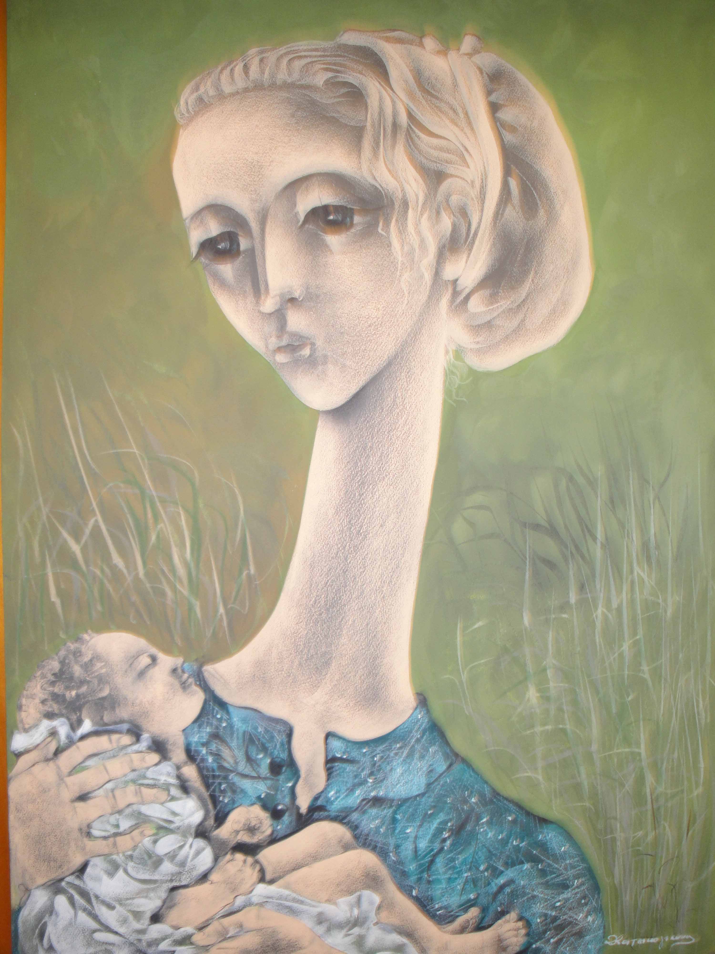 Ο Δημήτρης Κατσικογιάννης, αφού μαθήτευσε δίπλα στο δάσκαλο Κώστα Δημητριάδη, με μαεστρία και ρεαλισμό, δίνει μια άλλη εκδοχή της «κατοχικής μάνας». Αυτή τη φορά μας συγκλονίζει ο αγώνας της αρχετυπικής ηρωίδας μητέρας, που λυσσαλέα κάνει τα πάντα, μέσα στις αντιξοότητες του πολέμου, για να σώσει την οικογένειά της και να την οδηγήσει ενωμένη έξω από τη δίνη των τραγικών γεγονότων που ζει. Με το κεφάλι ψηλά και πρόσωπο τραχύ σαν πέτρα, μοιάζει με ακλόνητο βράχο που όσες επιθέσεις και αν δεχτεί, στέκει εκεί… πάντα περήφανη και δυνατή (εικ. 6, 8). Σκιαγραφεί αριστοτεχνικά το πορτρέτο της αλύγιστης –μα και τόσο ανθρώπινης– ηρωίδας. Είναι η μάνα σύμβολο που μένει όρθια ακόμα κι όταν όλα γύρω της έχουν γκρεμιστεί. Με βλέμμα αγέρωχο, μοιάζει να κοιτάζει έξω… τον ήλιο, την ελπίδα, που φαίνεται ότι έρχεται από μακριά. Άλλες φορές, το πρόσωπό της θλιμμένο, αλλά ταυτόχρονα τόσο όμορφο και τρυφερό, τη στιγμή που κοιτάζει το μωρό της που κοιμάται ήσυχα (εικ. 7) ή τη στιγμή που το κρατά στην αγκαλιά της και παίζει μαζί του (εικ. 9), αποπνέει μια συγκρατημένη καλοσύνη. Τα τεράστια μάτια της φανερώνουν πως δοκίμασε όλες τις τραγωδίες της ζωής και πως ανέβηκε σκαλί σκαλί τον πόνο και τα βάσανα, για να χτίσει αυτήν την ανυπέρβλητη και σεβάσμια προσωπικότητα. Μοιάζει με άπαρτο οχυρό, που αντιμετωπίζει τον κίνδυνο με παρρησία και τόλμη. Μέσα από το χρωστήρα του αντικρίζουμε με δέος και συγκίνηση τη μάνα-ηρωίδα της εκάστοτε Κατοχής… του εκάστοτε Πολέμου…