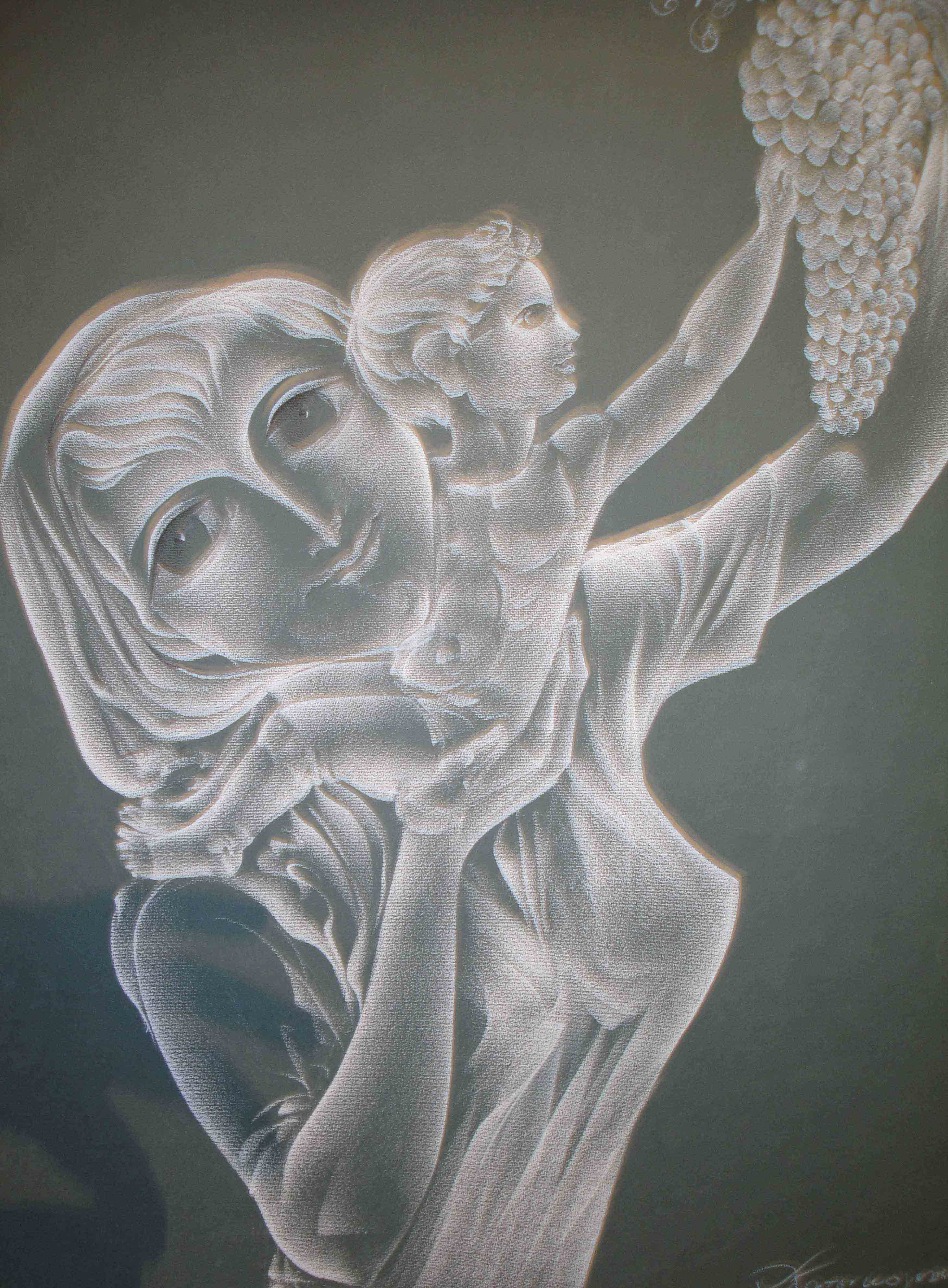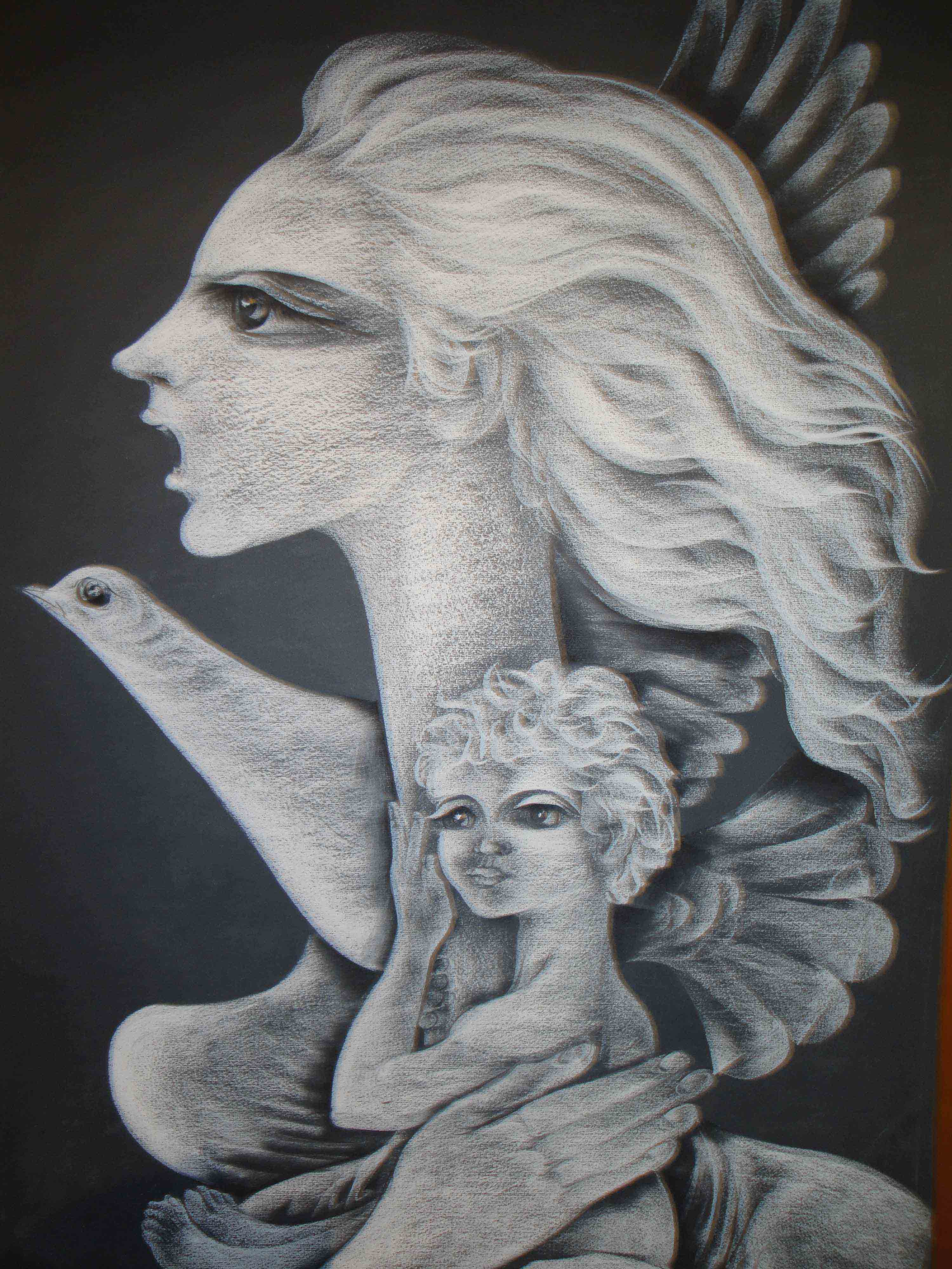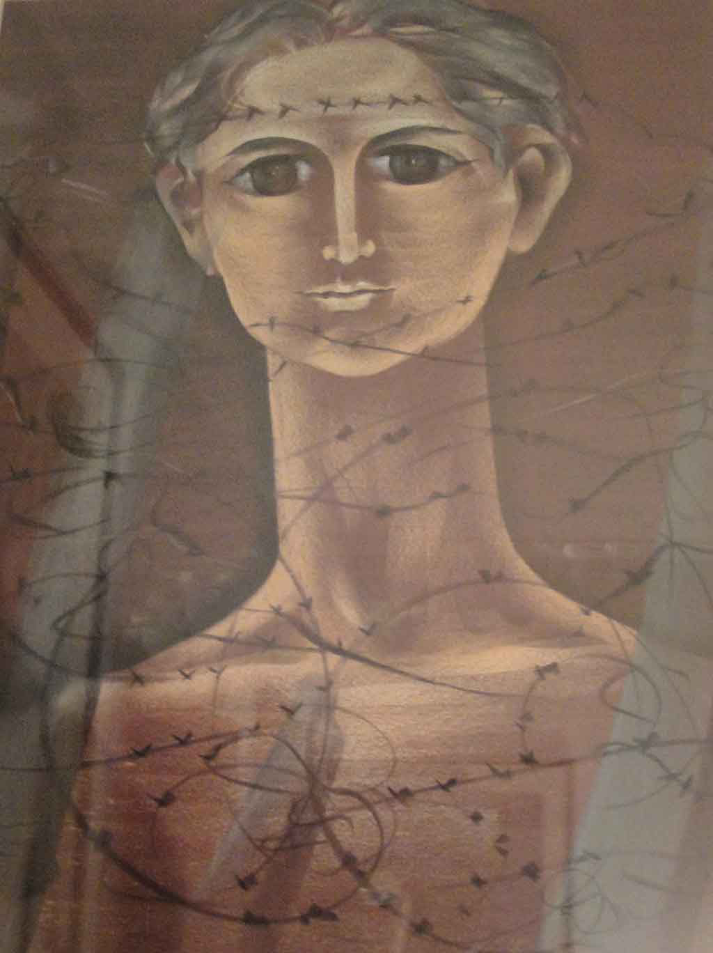 Ο Δημήτρης Κατσικογιάννης, αφού μαθήτευσε δίπλα στο δάσκαλο Κώστα Δημητριάδη, με μαεστρία και ρεαλισμό, δίνει μια άλλη εκδοχή της «κατοχικής μάνας». Αυτή τη φορά μας συγκλονίζει ο αγώνας της αρχετυπικής ηρωίδας μητέρας, που λυσσαλέα κάνει τα πάντα, μέσα στις αντιξοότητες του πολέμου, για να σώσει την οικογένειά της και να την οδηγήσει ενωμένη έξω από τη δίνη των τραγικών γεγονότων που ζει. Με το κεφάλι ψηλά και πρόσωπο τραχύ σαν πέτρα, μοιάζει με ακλόνητο βράχο που όσες επιθέσεις και αν δεχτεί, στέκει εκεί… πάντα περήφανη και δυνατή (εικ. 6, 8). Σκιαγραφεί αριστοτεχνικά το πορτρέτο της αλύγιστης –μα και τόσο ανθρώπινης– ηρωίδας. Είναι η μάνα σύμβολο που μένει όρθια ακόμα κι όταν όλα γύρω της έχουν γκρεμιστεί. Με βλέμμα αγέρωχο, μοιάζει να κοιτάζει έξω… τον ήλιο, την ελπίδα, που φαίνεται ότι έρχεται από μακριά. Άλλες φορές, το πρόσωπό της θλιμμένο, αλλά ταυτόχρονα τόσο όμορφο και τρυφερό, τη στιγμή που κοιτάζει το μωρό της που κοιμάται ήσυχα (εικ. 7) ή τη στιγμή που το κρατά στην αγκαλιά της και παίζει μαζί του (εικ. 9), αποπνέει μια συγκρατημένη καλοσύνη. Τα τεράστια μάτια της φανερώνουν πως δοκίμασε όλες τις τραγωδίες της ζωής και πως ανέβηκε σκαλί σκαλί τον πόνο και τα βάσανα, για να χτίσει αυτήν την ανυπέρβλητη και σεβάσμια προσωπικότητα. Μοιάζει με άπαρτο οχυρό, που αντιμετωπίζει τον κίνδυνο με παρρησία και τόλμη. Μέσα από το χρωστήρα του αντικρίζουμε με δέος και συγκίνηση τη μάνα-ηρωίδα της εκάστοτε Κατοχής… του εκάστοτε Πολέμου…