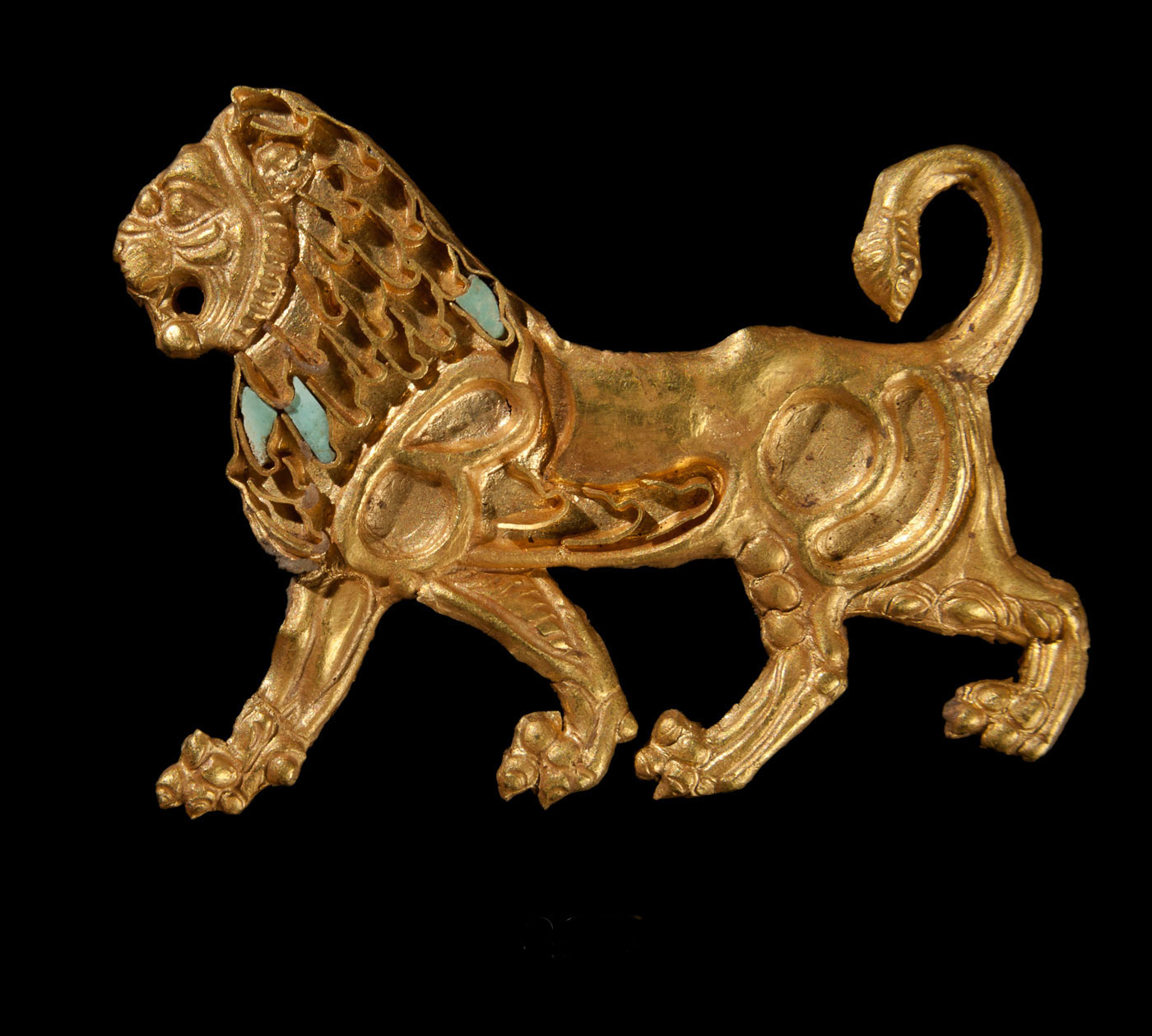 Εικ. 8. Χρυσό έλασμα με μορφή λιονταριού. Το συγκεκριμένο προέρχεται από τη Σαμοθράκη, ενώ ανάλογο παρουσιάστηκε στην έκθεση «Δωδώνη – Το Μαντείο των Ήχων». Η προέλευσή του πιθανόν να είναι περσική ή λυδική. © Μουσείο Ακρόπολης. Φωτ. Σωκράτης Μαυρομμάτης.