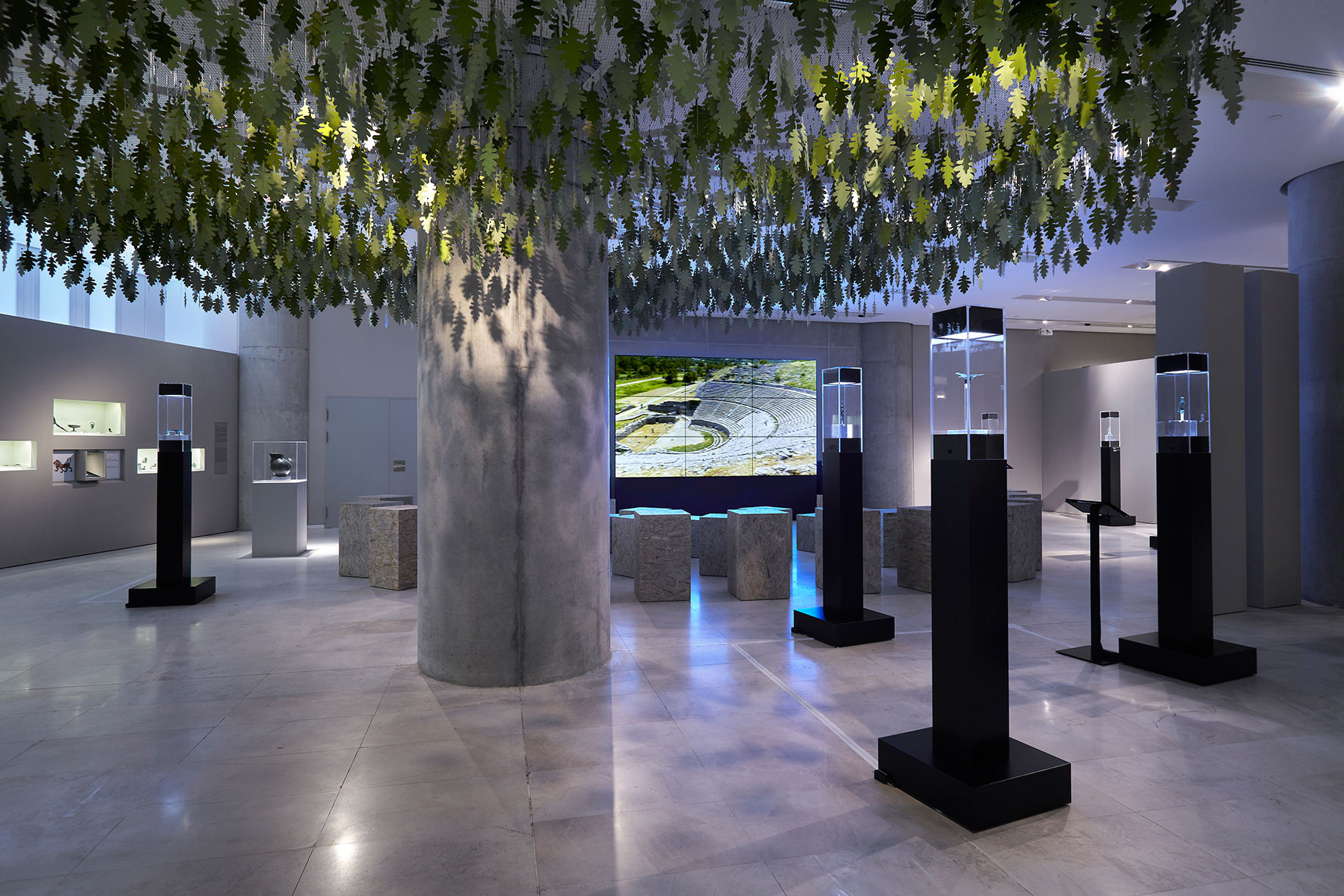 Ο χώρος της έκθεσης διαμορφώθηκε με τρόπο που να ανακαλεί στη μνήμη το φυσικό τοπίο του ιερού, αλλά και τα μνημεία γύρω από αυτό. Στο κέντρο της αίθουσας ένα υποστύλωμα της σύγχρονης αίθουσας μετατράπηκε αφαιρετικά σε βελανιδιά με οκτώ χιλιάδες φύλλα, παραπέμποντας στο θρόισμα των φύλλων στη Δωδώνη, μέσω του οποίου ερμηνευόταν η απάντηση του θεού στα ερωτήματα των ανθρώπων.