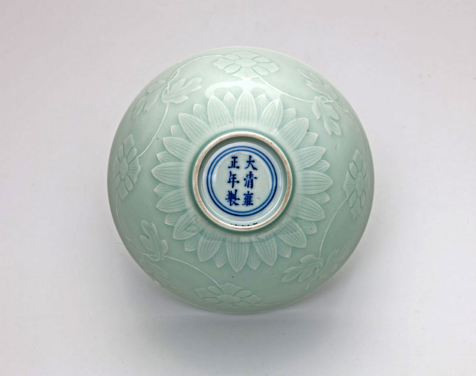 Εικ. 2. Κούπα από την έκθεση «Κεραμική από την Κίνα». Πορσελάνη με διακόσμηση εγχάρακτη και από μήτρα. Επιγραφή: «Κατασκευασμένο κατά τη βασιλεία Γιοντσέν της μεγάλης δυναστείας Τσινγκ». Τσιανγκσί, Τσιντετζέν. Τσινγκ, Γιοντσέν (1723–1735). ΓΕ 2744. Μουσείο Μπενάκη, Αθήνα.