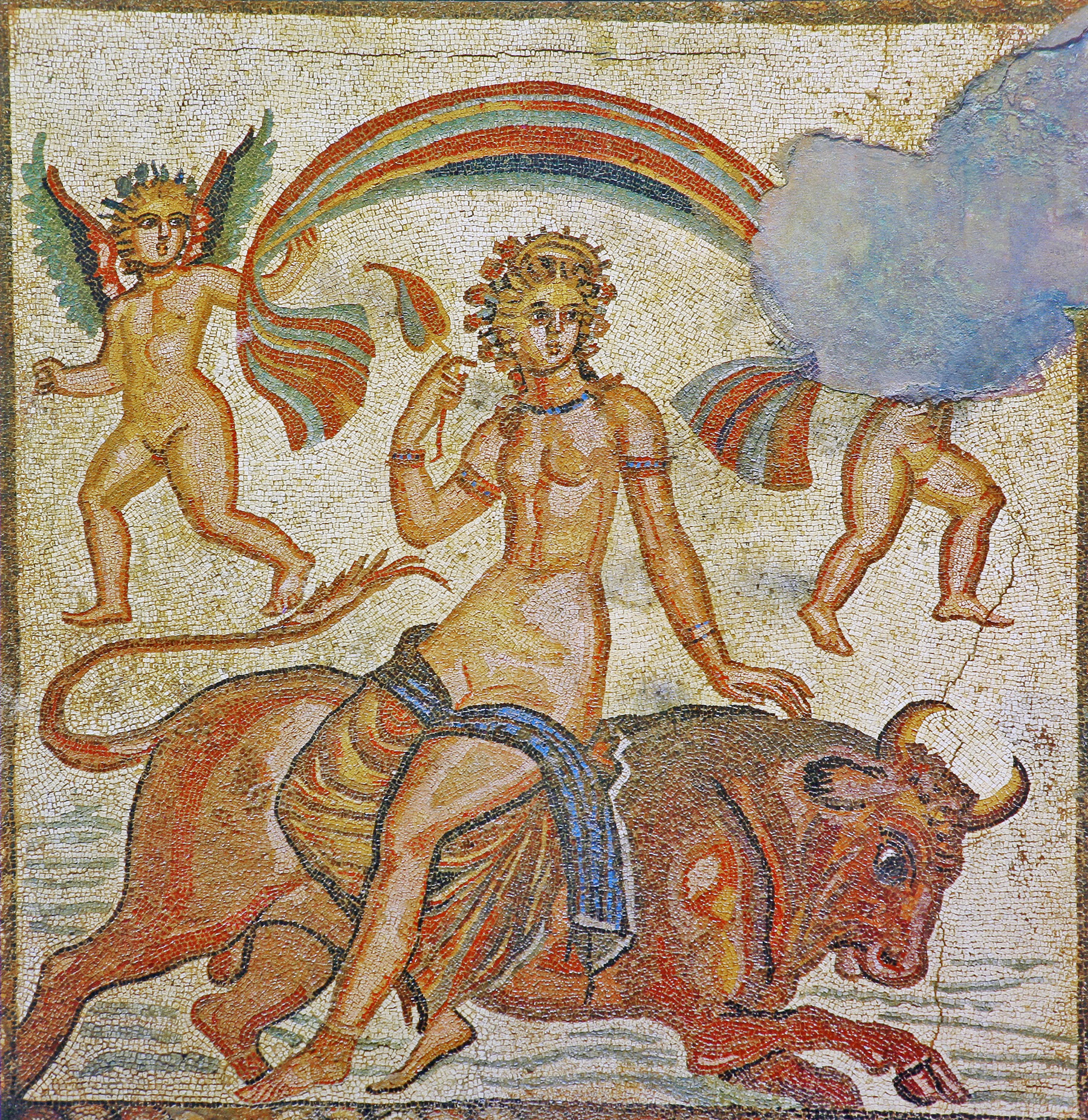 Το ψηφιδωτό με την παράσταση της αρπαγής της Ευρώπης, διαστάσεων 2,06×2 μ., είναι το κεντρικό θέμα του ενός ψηφιδωτού (ψηφοθετημένου) δαπέδου. Η Ευρώπη αποδίδεται ως γυμνή νεαρή γυναίκα καθισμένη επάνω στον μεταμορφωμένο σε ταύρο Δία, σε κίνηση προς τα δεξιά, ενώ δύο φτερωτοί ερωτιδείς συγκρατούν το ιμάτιό της, θυμίζοντας παραστάσεις της θαλάσσιας Αφροδίτης. Πρόκειται για ένα σπάνιο εικονογραφικό σχήμα που καθιστά το ψηφιδωτό ιδιαίτερο. Το ψηφιδωτό με την παράσταση του Ορφέα, διαστάσεων 1,40×1,13 μ., απεικονίζει τη μυθική φιγούρα του Ορφέα με τη λύρα του να σαγηνεύει τα ζώα, τα πτηνά και ερπετά.