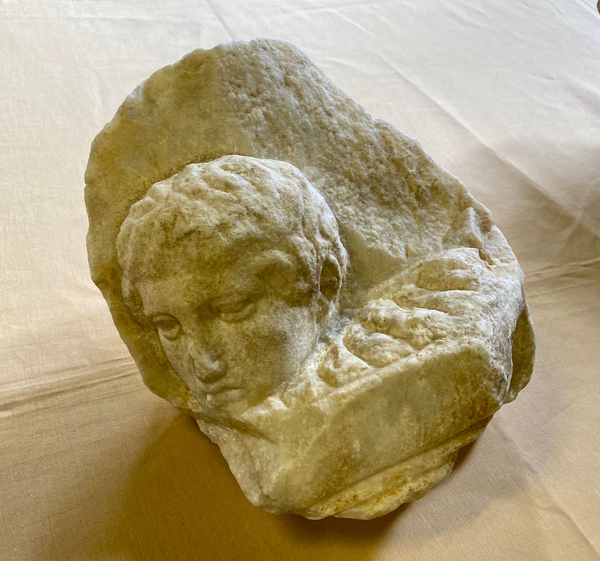 Το πρώτο απεικονίζει το κεφάλι ενός αλόγου από το δυτικό αέτωμα, το δεύτερο κεφαλή άνδρα που κρατάει έναν δίσκο και το τρίτο ανάγλυφο απεικονίζει γενειοφόρο ανδρικό κεφάλι.