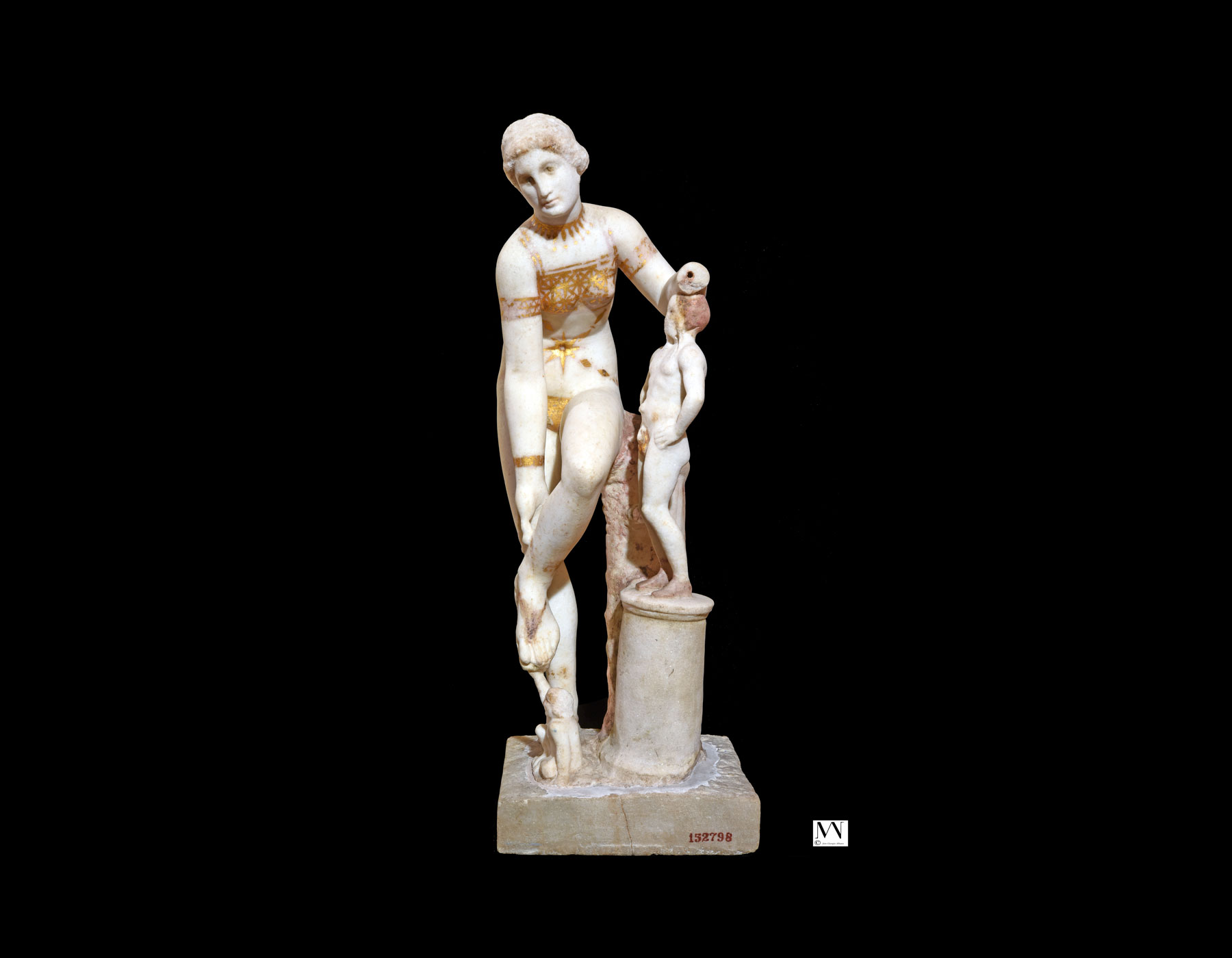 «…Το αγαλμάτιο βρέθηκε μαζί με άλλες αρχαιότητες το 1954 στη λεγόμενη έκτοτε “Οικία της Αφροδίτης” στην Πομπηία και φυλάχθηκε στο “Μυστικό Δωμάτιο” του Αρχαιολογικού Μουσείου της Νάπολης, λόγω της εξαιρετικής του ποιότητας, της σπανιότητας των διακοσμητικών στοιχείων του καθώς και της ερωτικής αύρας που αποπνέει…»