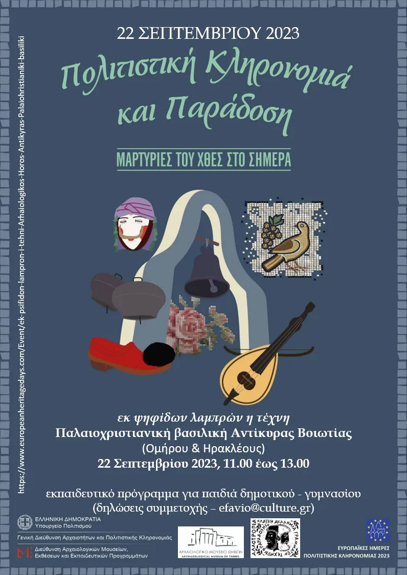 Στο πλαίσιο των Ευρωπαϊκών Ημερών Πολιτιστικής Κληρονομιάς 2023, με γενικό θέμα «Πολιτιστική Κληρονομιά και Παράδοση – Μαρτυρίες του χτες και του σήμερα», η Εφορεία Αρχαιοτήτων (ΕΦΑ) Βοιωτίας σε συνεργασία με το Μουσείο Αλλοτροπίας θα πραγματοποιήσει εκπαιδευτικό πρόγραμμα με τίτλο «Εκ ψηφίδων λαμπρών η τέχνη». Όπως ενημερώνει σχετική ανακοίνωση της ΕΦΑ Βοιωτίας, η νέα εκπαιδευτική δράση δημιουργήθηκε με αφορμή τον φετινό εορτασμό για παιδιά ηλικιακών ομάδων δημοτικού και γυμνασίου, με σκοπό να ταξιδέψουν μέσα από τις ψηφιδωτές δημιουργίες που έχουν αποκαλυφθεί στην Αντίκυρα και στο Δίστομο Βοιωτίας και να μάθουν πώς κατασκευάζεται ένα ψηφιδωτό, με συνθέσεις και μοτίβα προερχόμενα από την παλαιοχριστιανική πεντάκλιτη βασιλική της Αντίκυρας που χρονολογείται στον 6ο αι. μ.Χ.