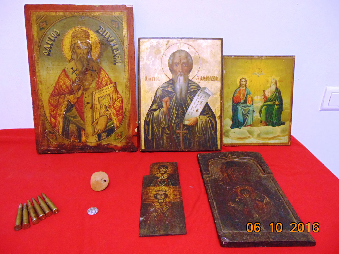 Μετά από έρευνα των αστυνομικών του Τμήματος Πολιτιστικής Κληρονομιάς και Αρχαιοτήτων της Διεύθυνσης Ασφαλείας Θεσσαλονίκης, στο Ι.Χ. αυτοκίνητο που χρησιμοποιούσαν αλλά και σε σπίτια του 59χρονου άντρα, βρέθηκαν και κατασχέθηκαν τμήμα λαβής πήλινου αγγείου, αδιάγνωστο πήλινο αντικείμενο, ασημένιο νόμισμα, πήλινο υφαντικό βάρος, καθώς και εικόνες στις οποίες απεικονίζονται διάφοροι άγιοι, όλα αντικείμενα που εμπίπτουν στις προστατευτικές διατάξεις του Νόμου περί Προστασίας Αρχαιοτήτων και εν γένει της Πολιτιστικής Κληρονομιάς.