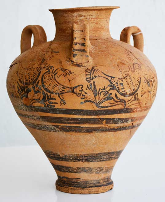 Ένα από τα δωμάτια του Στρώματος 3 περιέχει τέσσερις αποθηκευτικούς χώρους, κατασκευασμένους από επίπεδους, επεξεργασμένους, κάθετα τοποθετημένους λίθους και μεγάλα κομμάτια πίθου, διακοσμημένου με ανάγλυφες κυματοειδείς γραμμές. Οι πίθοι πιθανόν χρησιμοποιήθηκαν για την αποθήκευση σιταριού και ελιών. Ένα μεγάλο τριβείο (σχεδόν 1 μ. σε πλάτος), τοποθετημένο στο κέντρο του διαδρόμου, μαζί με αρκετά μικρότερα και δύο μικρούς τριπτήρες υποδηλώνουν την επεξεργασία δημητριακών ή λαχανικών. Αυτό ενισχύεται από την προκαταρκτική εξέταση των αρχαιοβοτανικών καταλοίπων, τα οποία αποτελούνται από κριθάρι, ελιές, σταφύλι και άλλα, επί του παρόντος απροσδιόριστα, δημητριακά. Μια σειρά από τρία σκληρά δάπεδα ήταν σε χρήση εντός του αποθηκευτικού χώρου. Τουλάχιστον δύο ακόμα εγκαταστάσεις ήταν τοποθετημένες σε αυτά τα δάπεδα, περιλαμβανομένης εστίας με τοιχώματα από πλίνθους και ενός στοιχείου που περιελάμβανε δύο πανομοιότυπες οπές στο έδαφος. Άλλα ευρήματα από αυτό το δωμάτιο περιλαμβάνουν θραύσματα από κύπελλα από φαγεντιανή, κατά πάσα πιθανότητα αιγυπτιακά, ένα αδράχτι και έναν πήλινο ταύρο/κέρνο, τύπου Δακτυλιόσχημης κεραμικής. Η κεραμική περιλαμβάνει ακόσμητους και χρηστικούς τύπους αλλά και δείγματα Λευκής Γραπτής Τροχήλατης, Λευκόχριστης Ι και ΙΙ, Δακτυλιόσχημης Ι και ΙΙ, καθώς και εισηγμένη μυκηναϊκή κεραμική. Υπάρχει επίσης και ένα σπάνιο δείγμα ενός διακοσμημένου φλασκιού, πιθανότατα εισηγμένου από την Εγγύς Ανατολή, και μια λαβή με εγχάρακτο σύμβολο της Κυπρομινωικής γραφής.
