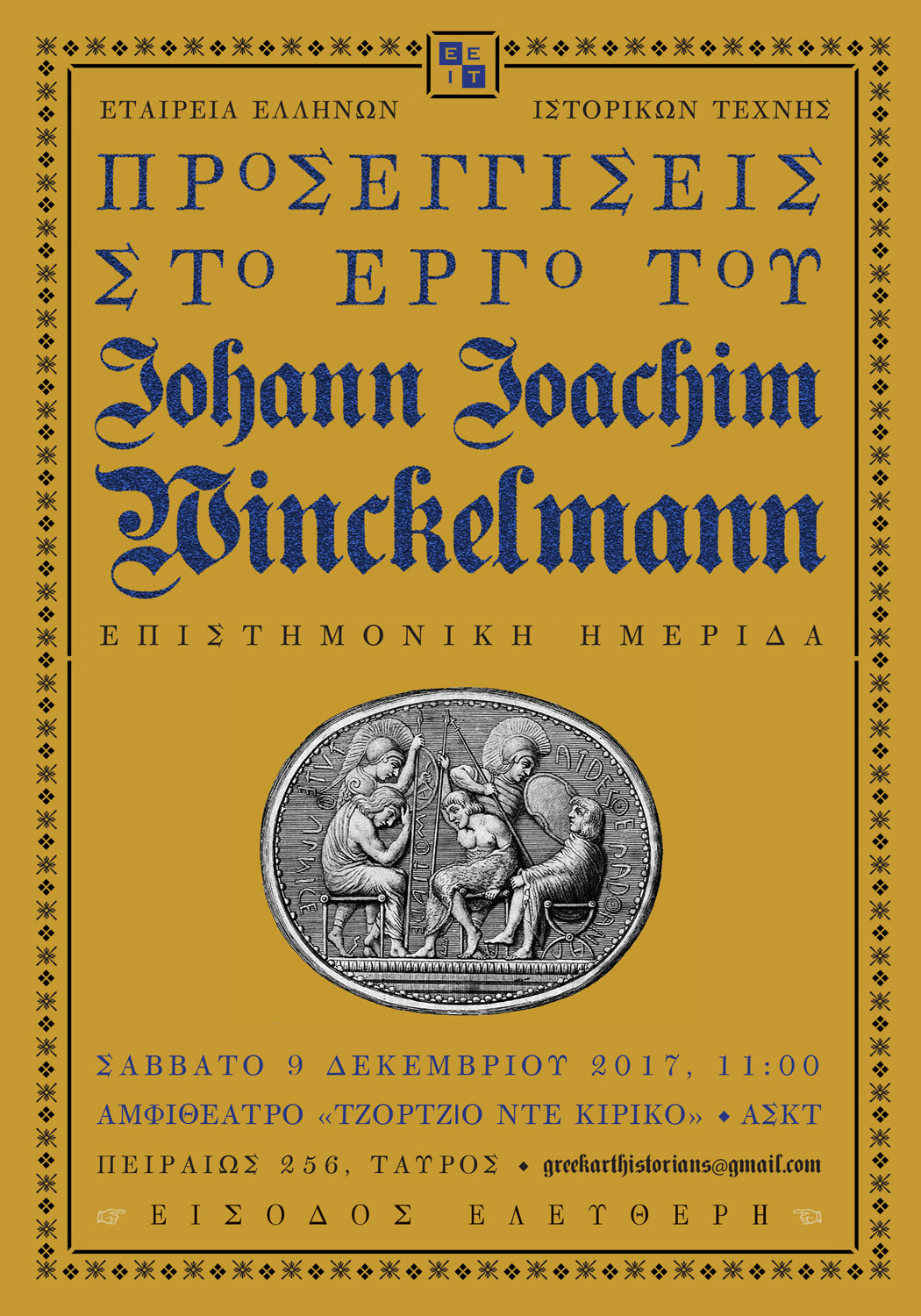 Επιστημονική ημερίδα με θέμα «Προσεγγίσεις στο έργο του Βίνκελμαν» διοργανώνει η Εταιρεία Ελλήνων Ιστορικών Τέχνης (ΕΕΙΤ) με αφορμή τα 300 χρόνια από τη γέννηση του Γιόχαν Γιοάχιμ Βίνκελμαν (1717-1768).